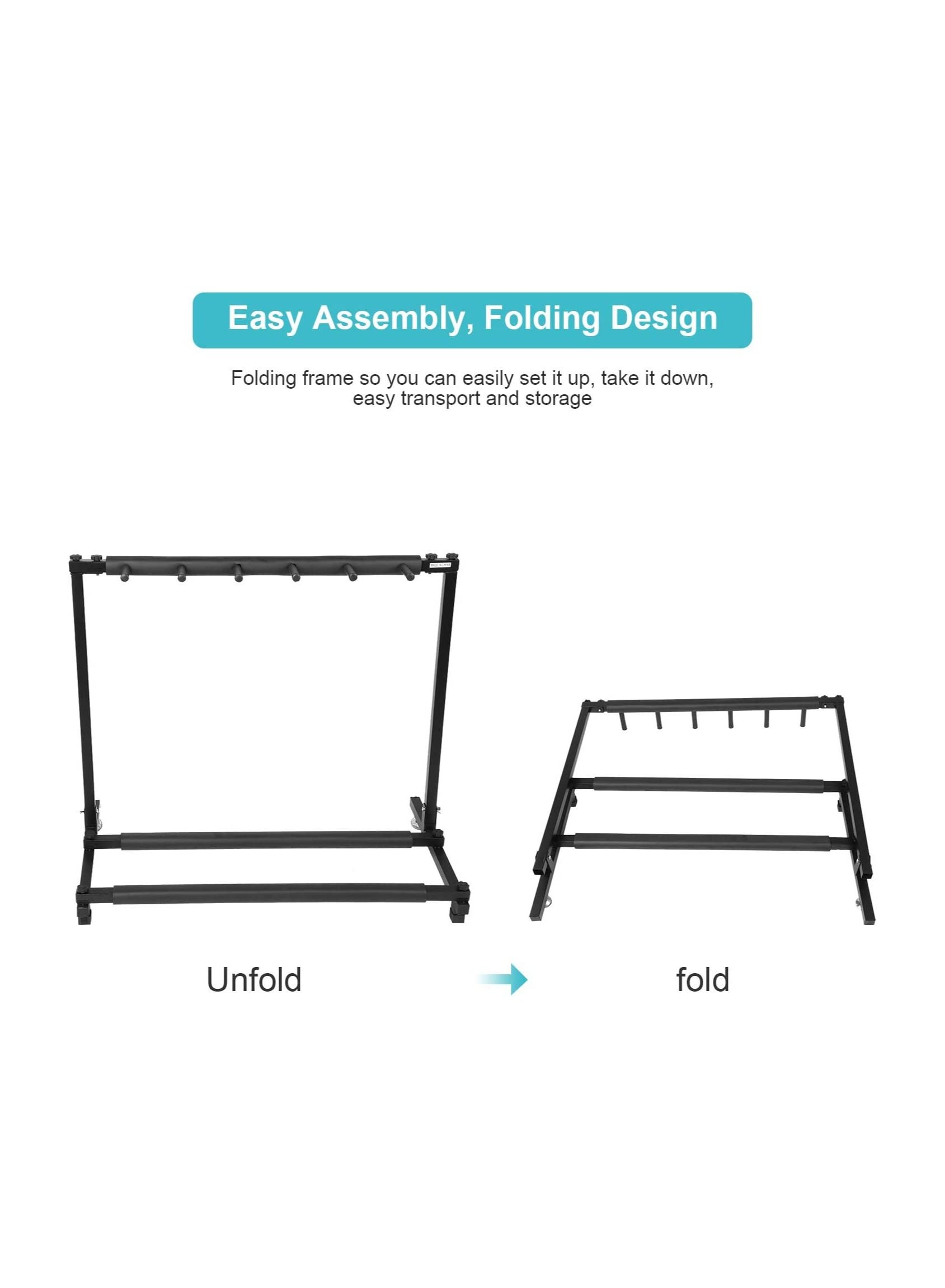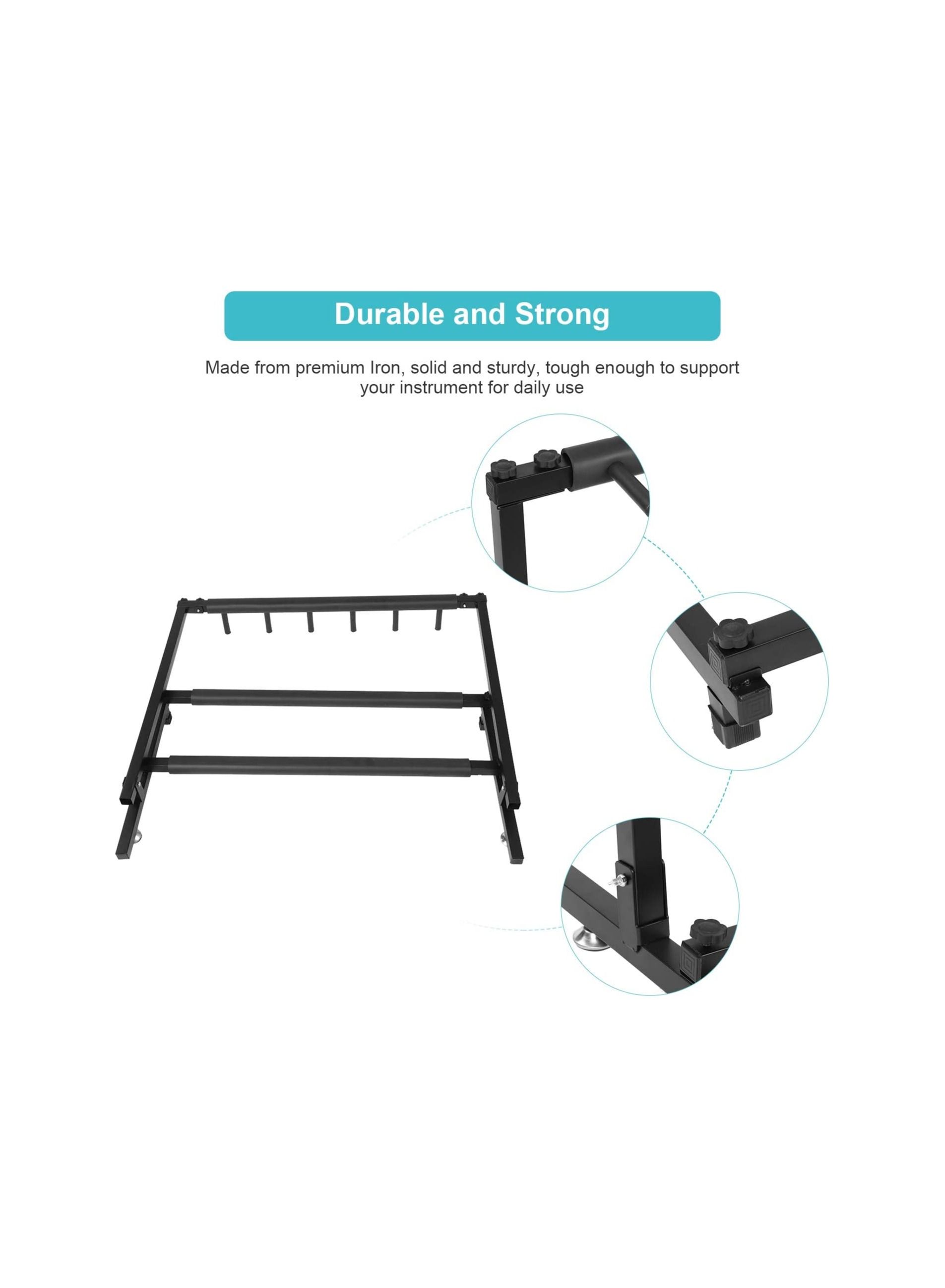 Introducing the Guitars Display Stand Rack, the perfect solution for organizing and displaying your guitar collection. This 5 way universal storage holder is designed to securely hold up to 5 guitars, making it ideal for use in training rooms, stores, or even at home. The stable iron frame and soft rubber cover provide a sturdy and protective base for your guitars, ensuring they remain in pristine condition. The soft rubber cover also prevents any scratches or damage to your guitars. This guitar collection rack organizer is easy to assemble and disassemble, making it convenient for storage and transportation. With its sleek and modern design, the Guitars Display Stand Rack is not only functional but also adds a touch of elegance to any space. Get your hands on this must-have accessory for any guitar enthusiast and showcase your collection in style!