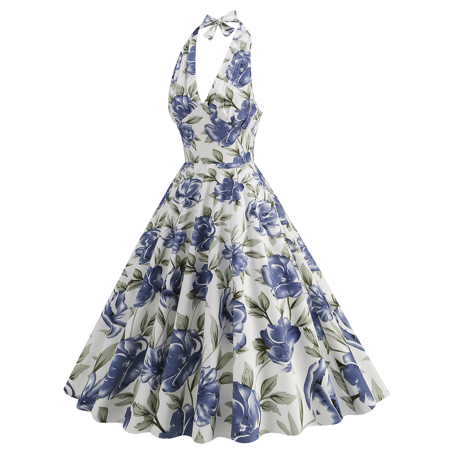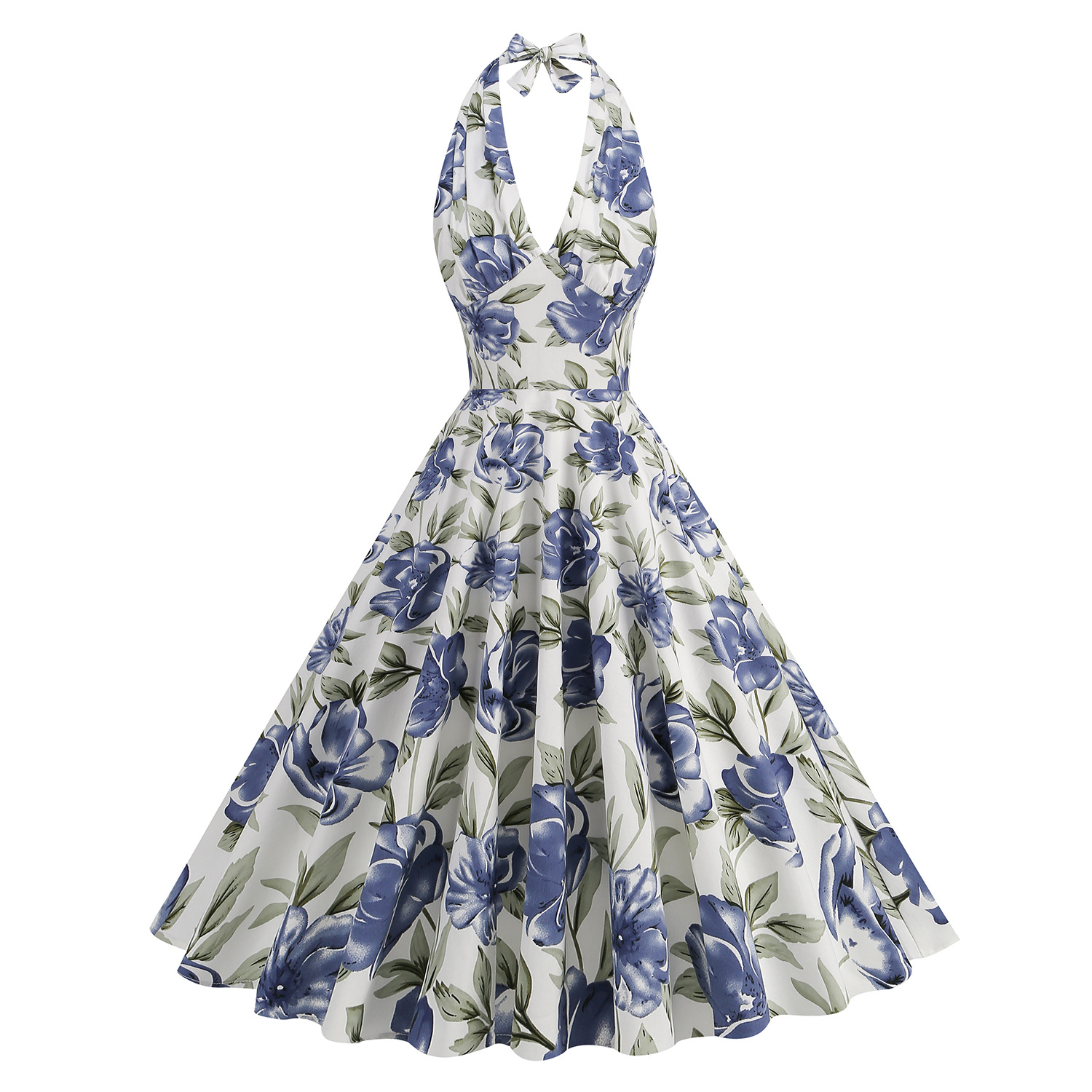 50 s European and American holiday age-reducing printing Hepburn style large swing high waist halter sexy dress dress performance clothing