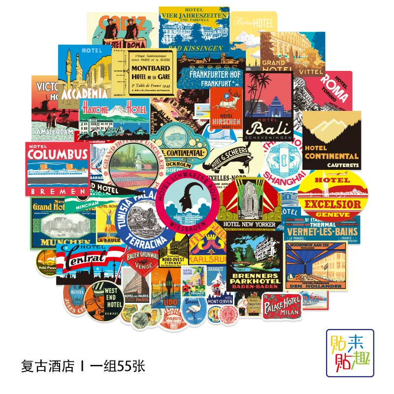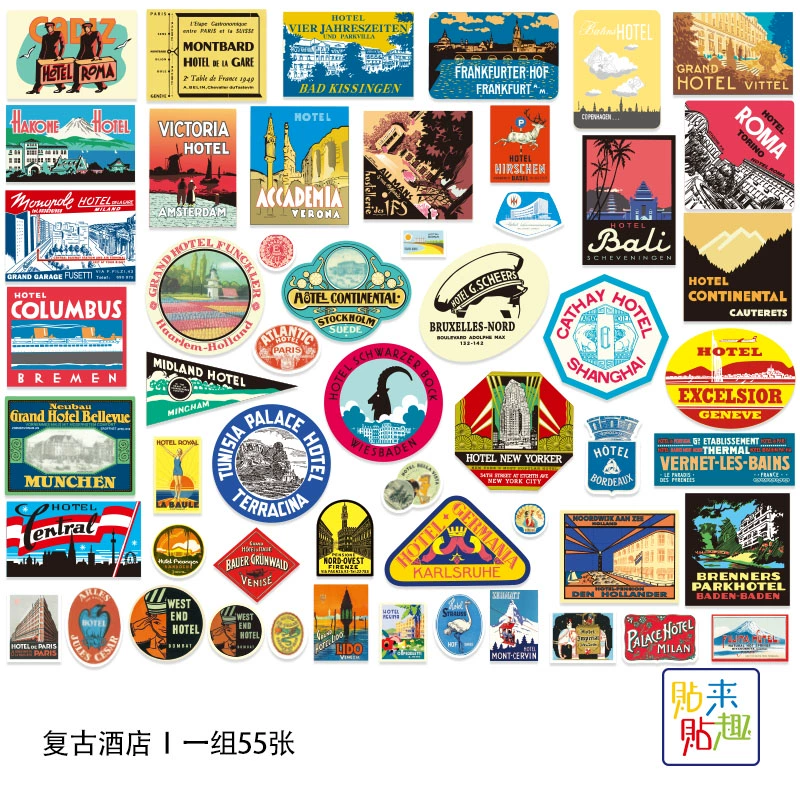 | nameOriginal | 55 retro hotel logo stickers, personalized Rimowa suitcase, literary and nostalgic box stickers, commemorative stickers, waterproof |