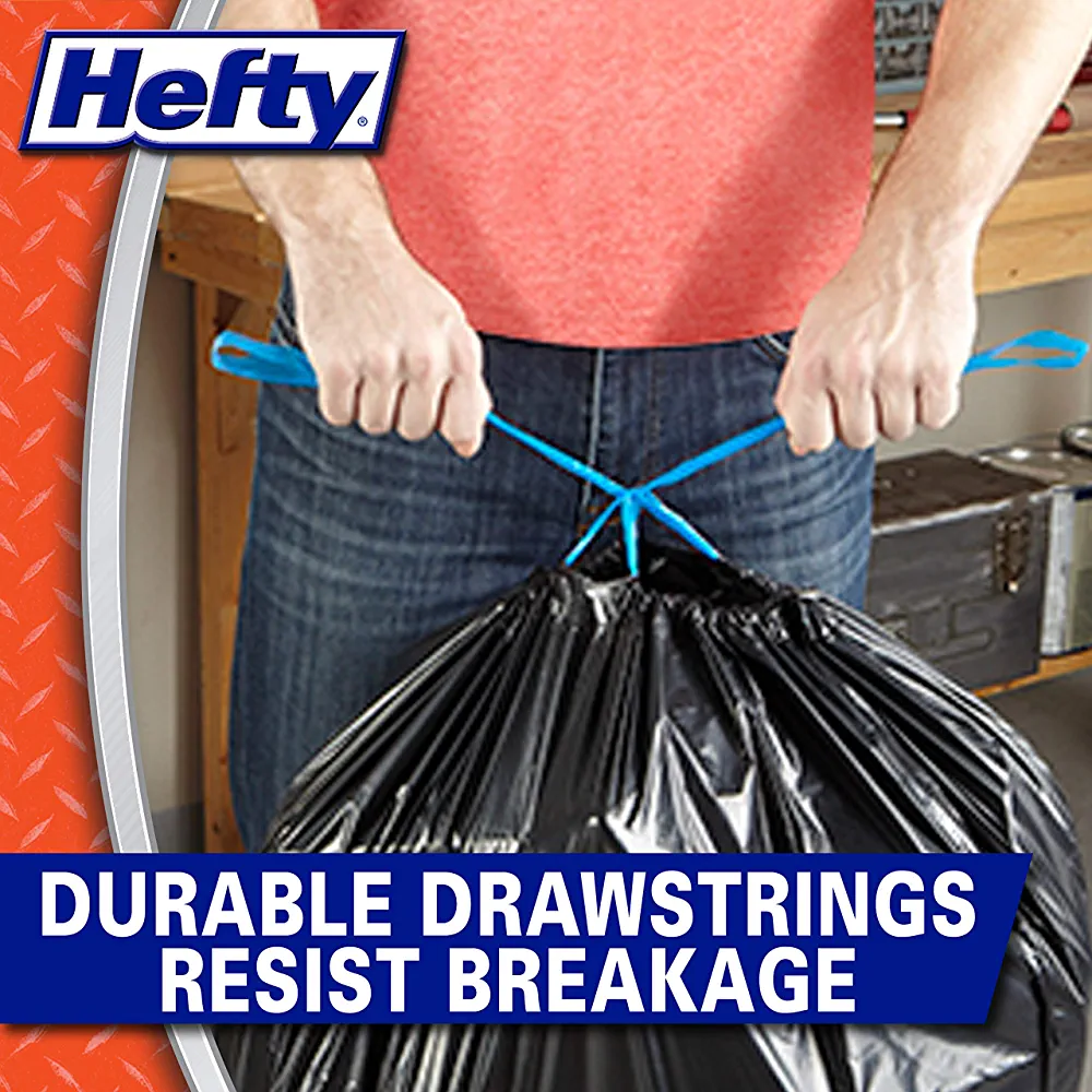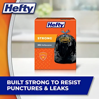 | descriptionOriginal | Description Hefty Strong Large Multipurpose Trash Bags help you tackle cleanup jobs all around the house, thanks to their Hefty! Hefty! Hefty! strength and large capacity. With their 30 gallon size, these garbage bags are ideal for collecting old clothes for donation, seasonal decorations, everyday kitchen trash and more. Signature Hefty quality and thick 1.05 millimeter plastic ensure these large trash bags deliver superior puncture resistance for outside and inside jobs. Plus, with their dependable drawstring closure, these heavy duty plastic trash bags resist breakage and make transporting easy. Count on these large drawstring trash bags for the strength and reliability you expect from Hefty. Don’t forget: all Hefty trash bags are backed by a 100% satisfaction guarantee. |