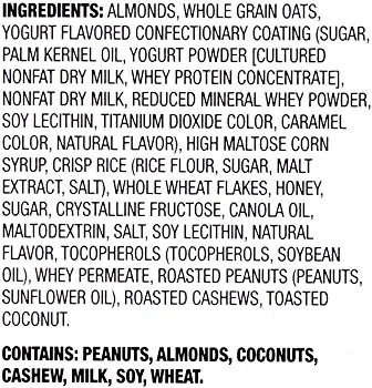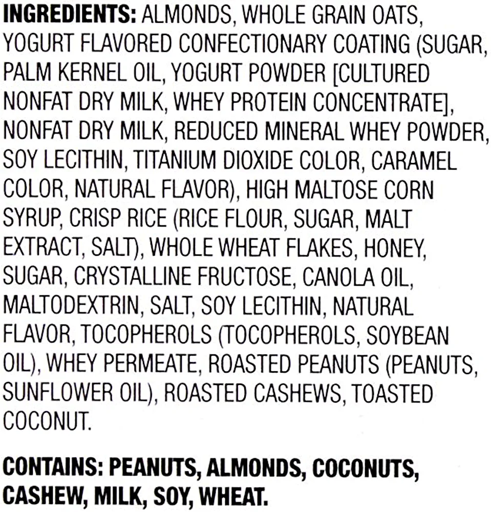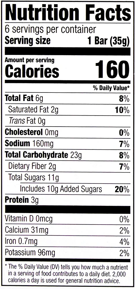 This box includes six individually wrapped granola bars, each weighing 1.2 ounces, for a total of 7.4 ounces. The bars are made with 100% whole grain oats and do not contain any artificial flavors. The ingredients include peanuts, almonds, coconut, cashews, milk, soy, and wheat. We stand behind our product and offer a satisfaction guarantee. If you are not satisfied with your purchase for any reason within a year, please contact us at 1-877-485-0385. This product is sold under the Amazon brand.