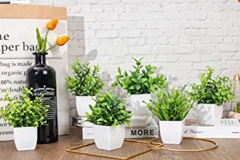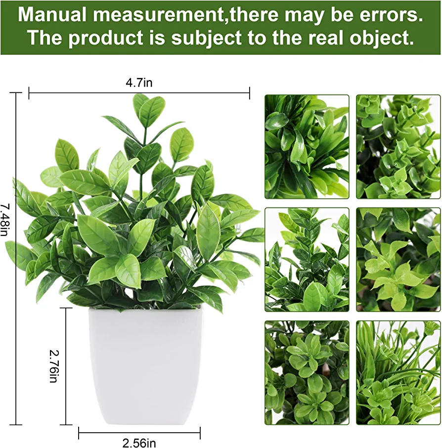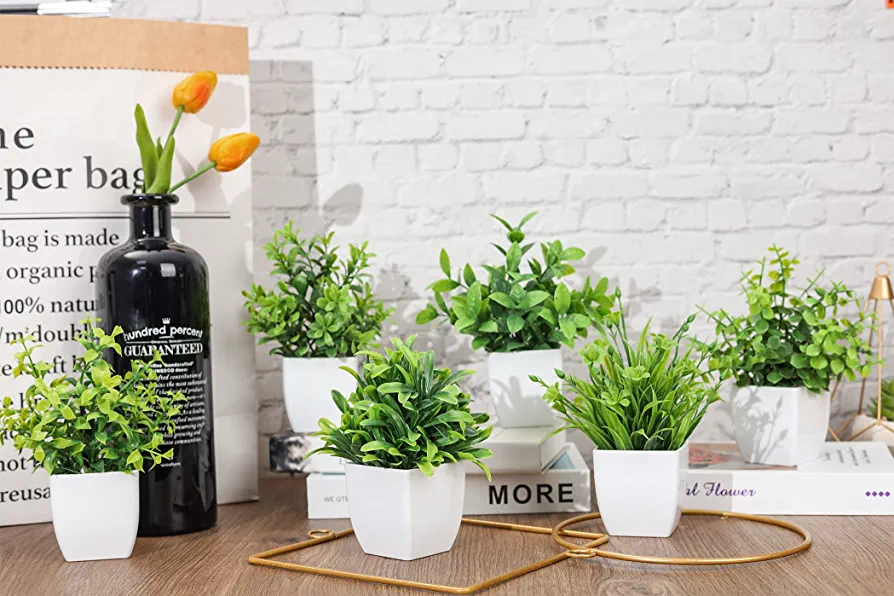 This set of 6 artificial potted plants offers a variety of styles to enhance your living room decor. Each plant measures approximately 6.5”-7” and comes in a compact pot measuring 2.5″D×2.7″H, making them perfect for decorating any space, including your bathroom. The leaves are made of high-quality plastic, ensuring they are safe, healthy, and easy to maintain. These indoor faux plants will remain green and vibrant for years to come. The white plastic pots are durable and sturdy. The simple white-green color scheme of these artificial plants makes them a versatile decoration option that will complement any room, including your office, kitchen, bedroom, farmhouse, or bathroom. Please note that the plastic material may have a slight odor, but this will dissipate with proper ventilation. Additionally, the leaves may be slightly compressed during shipping, so please adjust them to achieve the best appearance.