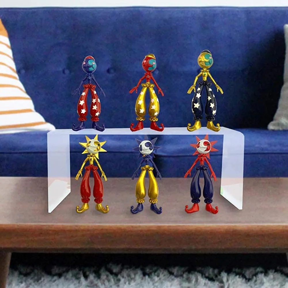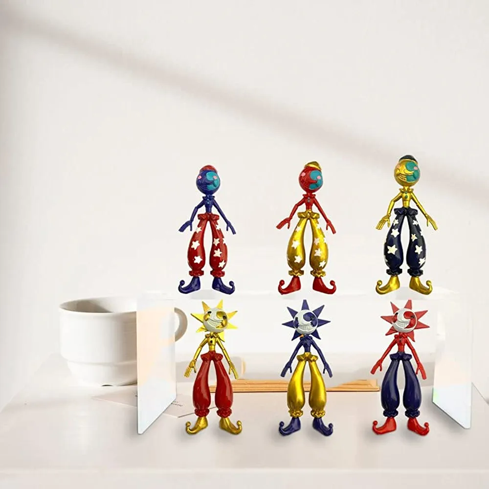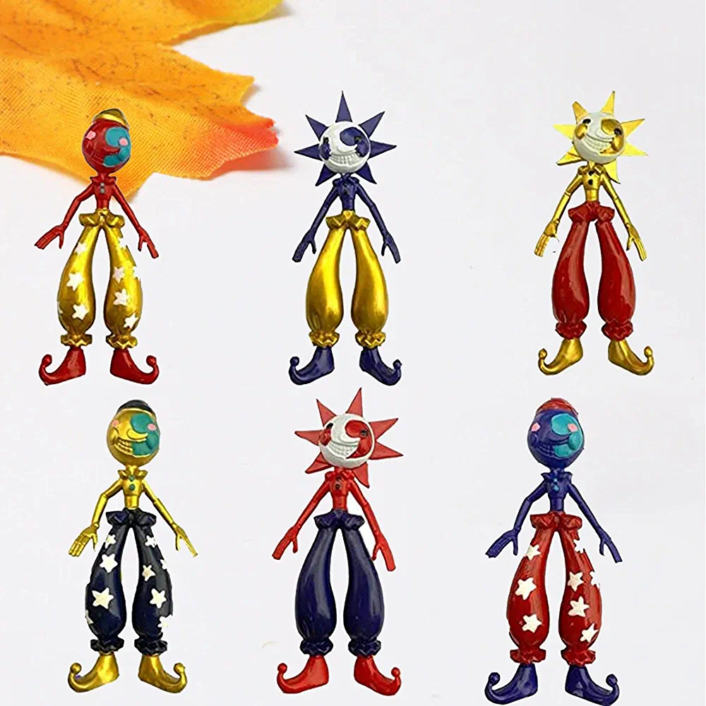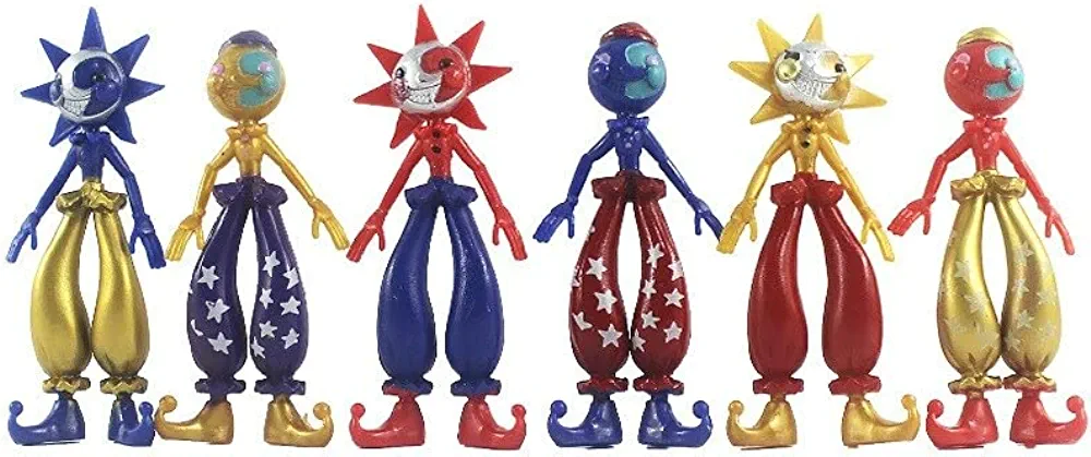 6-piece set of FNAF Sundrop and Moondrop Action Figures, featuring cute cartoon anime clowns from the Security Breach video game. Perfect for home decoration and as a gift for video game fans.