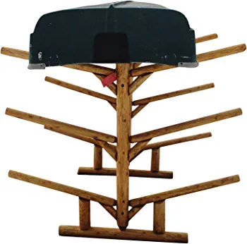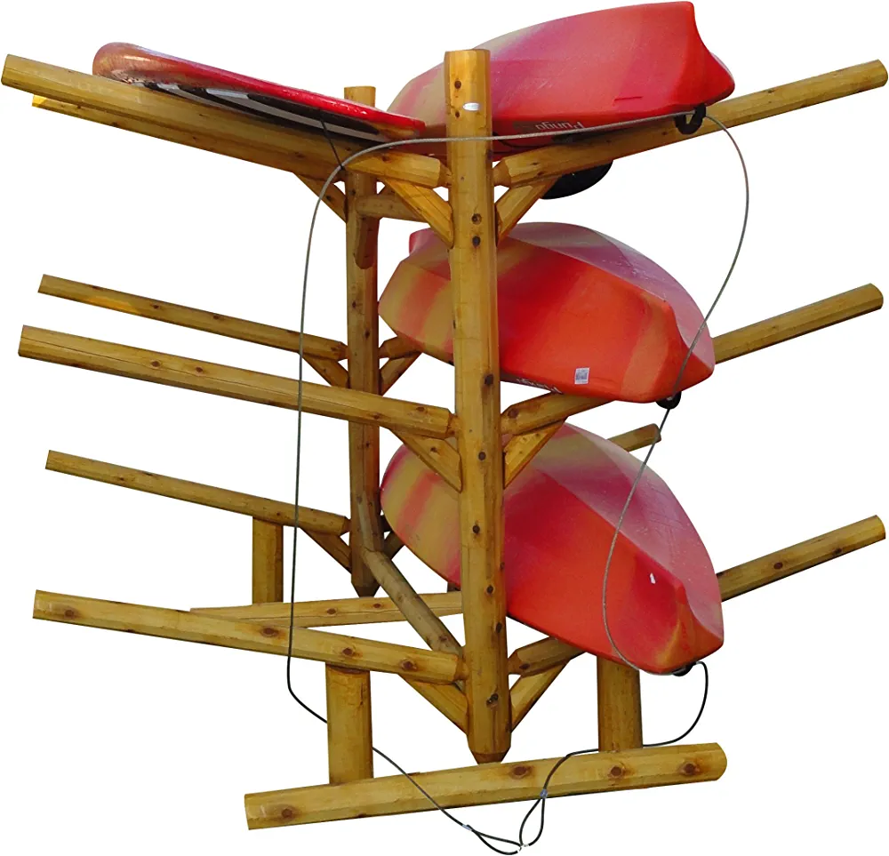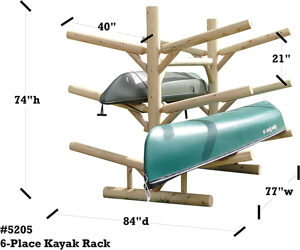This product is designed to accommodate up to six kayaks, surfboards, canoes, or SUPs, with each boat weighing up to 100 pounds. It is constructed using high-quality northern white cedar logs and mortise and tenon joinery, ensuring durability and longevity. This product is proudly made in Manitowish Waters, Wisconsin, USA, and comes with a one-year warranty. It is finished with a transparent natural finish, and measures 74 inches in height, 84 inches in depth, and 77 inches in width. Assembly is required.
