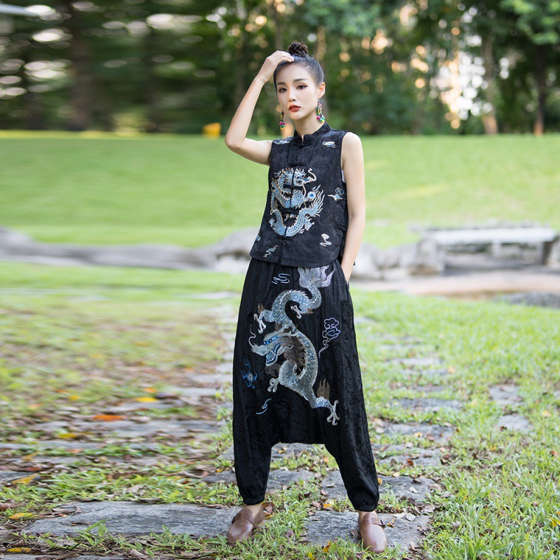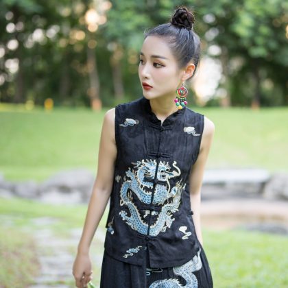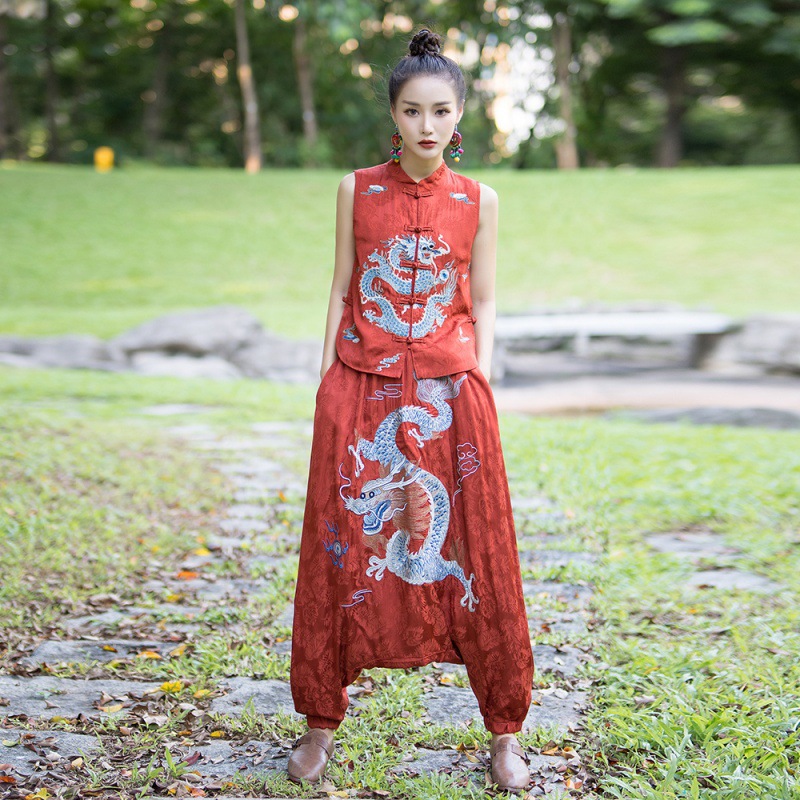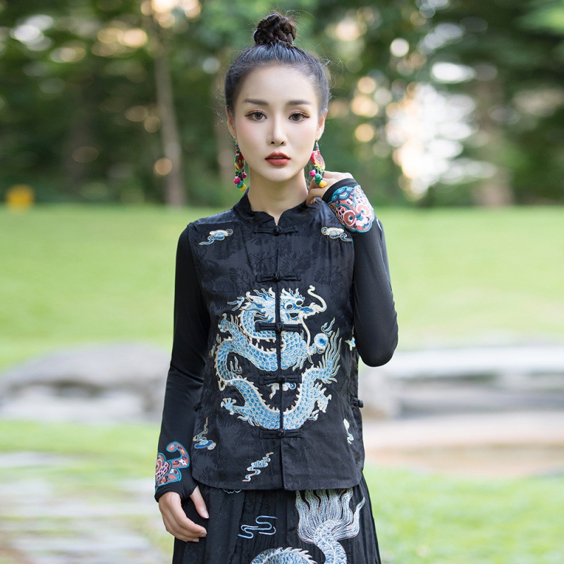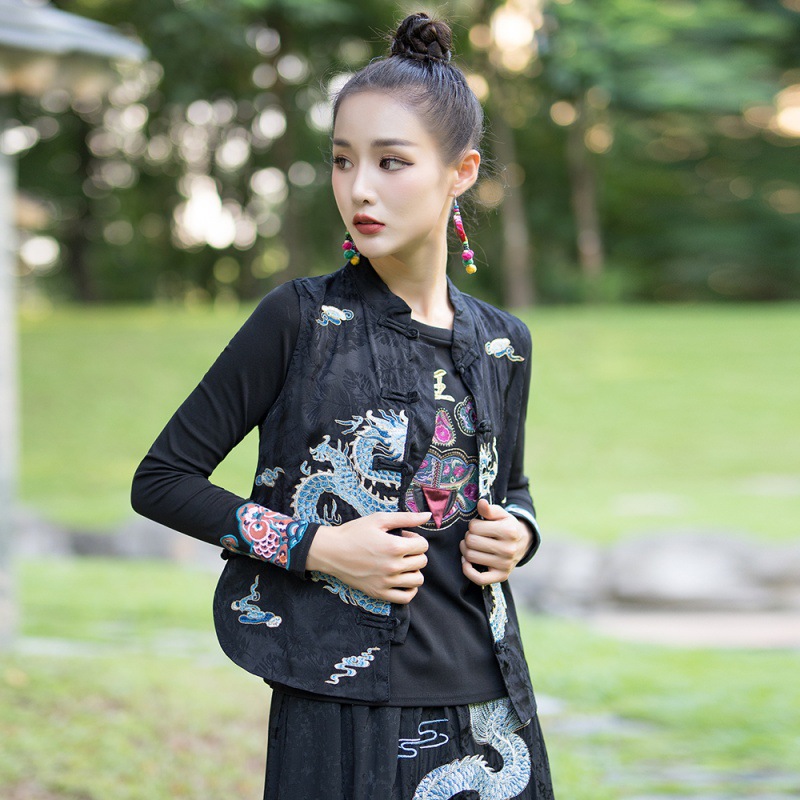60932 autumn new ethnic style embroidered dragon plate buckle vest short waistcoat Chinese style satin top