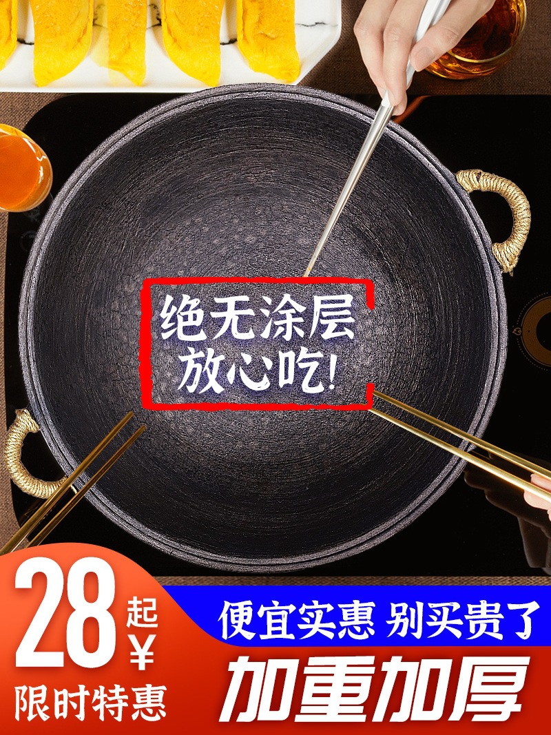 | nameOriginal | 61K3 handmade cast iron old-fashioned wok thickened double-ear turtle pattern pig iron pot size hot pot household non-stick non-coated |