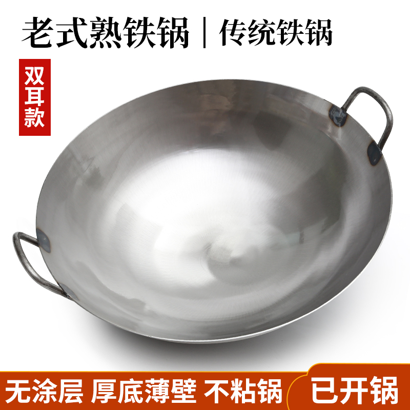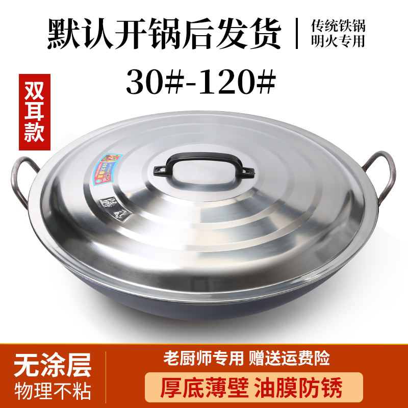 6BUJ Commercial Thickened Double-ear Large Iron Pot Household Old-fashioned Wasted Iron Wok Uncoated Concave Induction Cooker Wood Stove