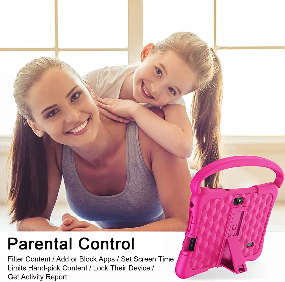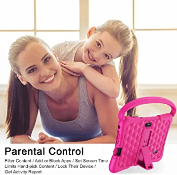 The tablet case is made of soft silicone material that protects it from scratches, bumps, and drops. It also features a colorful handle and an adjustable stand on the back, allowing toddlers to go hands-free while watching videos or video chatting.