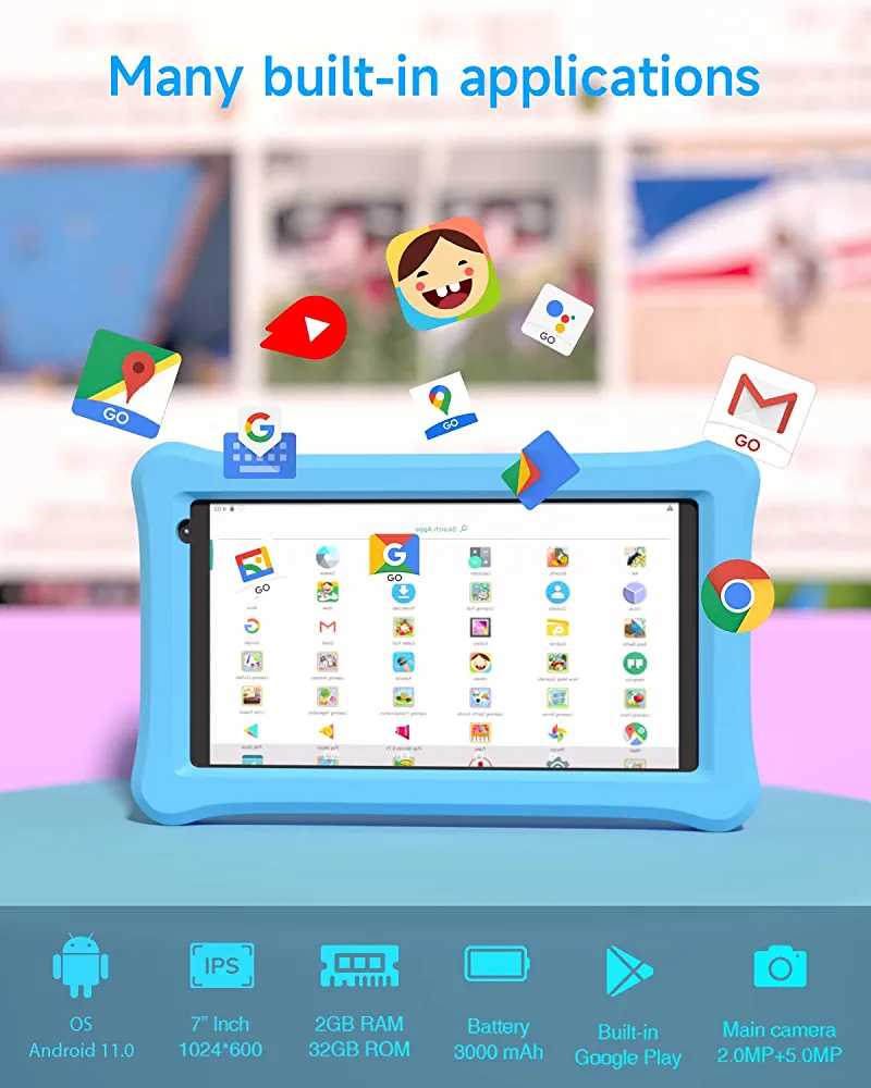 Introducing a 7-inch tablet designed specifically for kids, equipped with the latest Android 11 system and a powerful quad-core processor that ensures smooth app performance. This tablet is GMS certified, allowing you to download apps from the Play Store such as YouTube, Netflix, and ABC Mouse. With a Micro SD card slot, you can expand the storage and download more apps and movies.