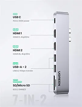 UGREEN 7 in 2 USB-C Hub DUAL ULTRA HD 4K OUTPUT The 2 HDMI ports of 4K@30 connections on this adapter not only mirror two screens with the same image but also maximum supporting 4K@30Hz for 3 screens simultaneously. And you can have a cinema – level visual feast – connected to HDTV, monitors, and projector for presentations, conference calls, video streaming, home theater, and more. Support mirror mode and extension mode for Mac OS Fast PD 100W Charging Supporting PD charging at max 100W, this multiport USB C adapter can quickly charge your MacBook Pro or MacBook Air while simultaneously using other ports. Compatible Devices: MacBook Pro 13 "2020/2019/2018 / 2017/2016 MacBook Pro 15" 2018 / 2017/2016 MacBook Pro 16 "2019/2020, MacBook Air 2020/2019/2018 * Other computer models are not supported at this time. NOTICE: 1. This USB c hub is not applicable for Sony / Asus / HP / Surface / Dell / Huawei / Samsung … laptops, all tablets, and cellphones. 2. To achieve maximum video resolution, a compatible HD monitor and cable are required. 3. For a stable connection, try not to connect the equipment with excessive power. 4. The USB 3.0 port is mainly used for data transmission. Charging is not recommended. Not support NTFS external hard drive. 5. When the hub is used on M1 Macbook Pro 2020 13-inch and Macbook Air 2020 13-inch, dual HDMI ports cannot support simultaneous display. 7-IN-2 USB C Adapter for Macbook Pro/Macbook Air