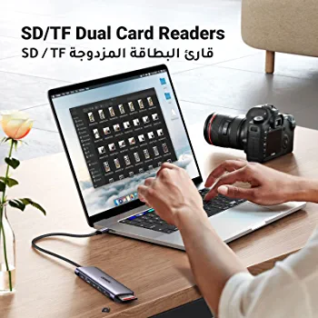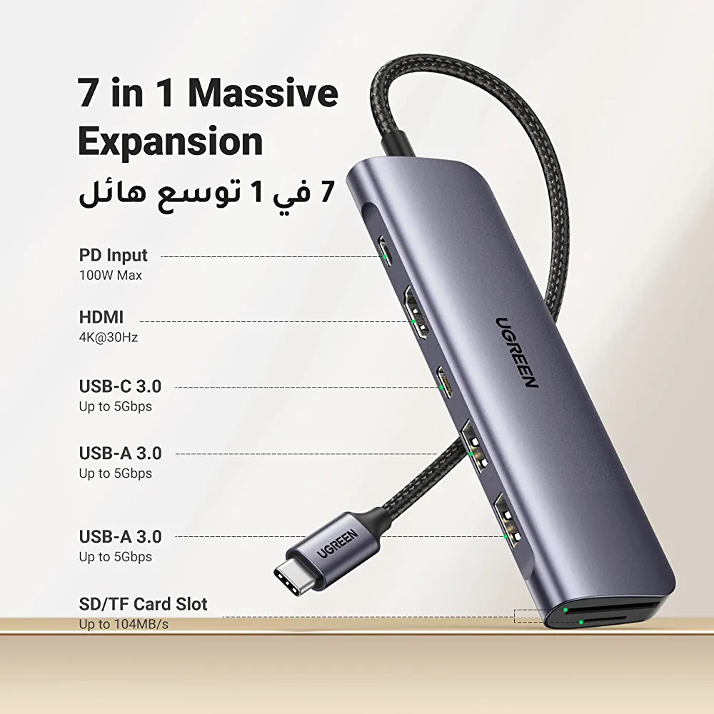 The UGREEN USB-C Hub is a compact and versatile 7-in-1 device that offers extensive connectivity options. It features 1 USB-C port and 2 USB-A 3.0 ports for data transfer speeds of up to 5Gbps, as well as an HDMI port that supports 4K resolution at 30Hz. The USB-C port also supports power delivery of up to 100W, making it ideal for charging laptops and other devices. Additionally, the hub has an SD card slot and a TF card slot with speeds of up to 104MB/s.