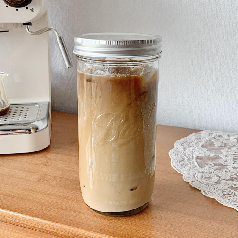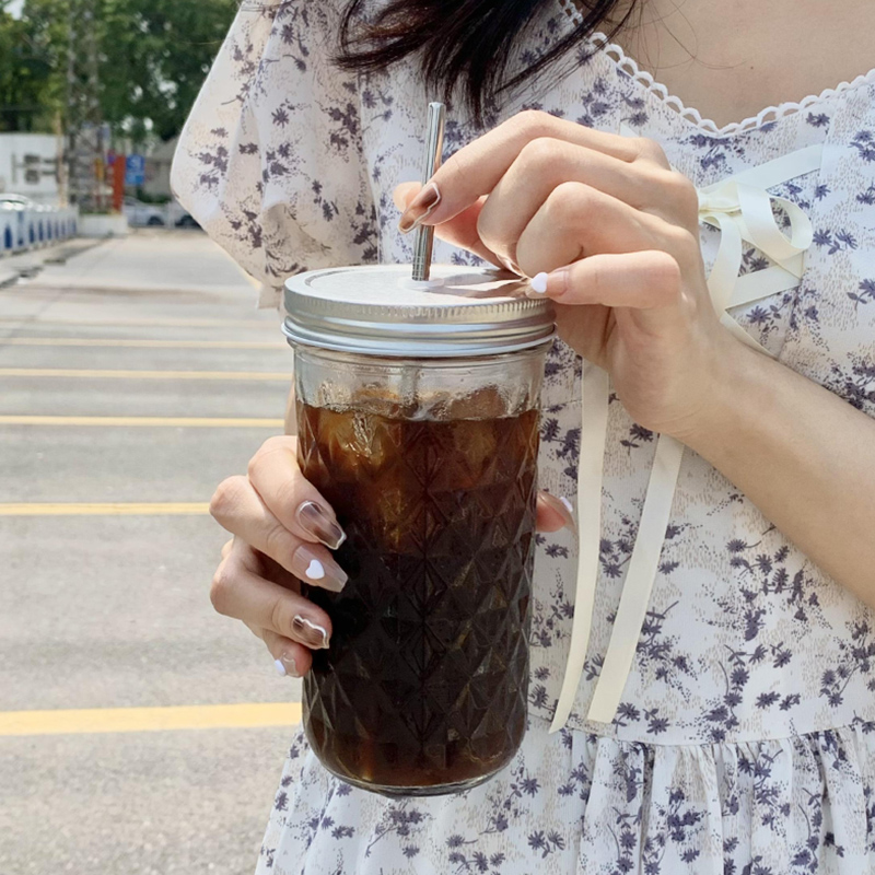 71TXins Wind Mason Cup American Hand-made Coffee Cup Glass with Straw and Lid with Large Cup