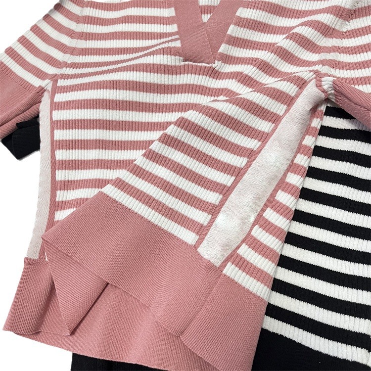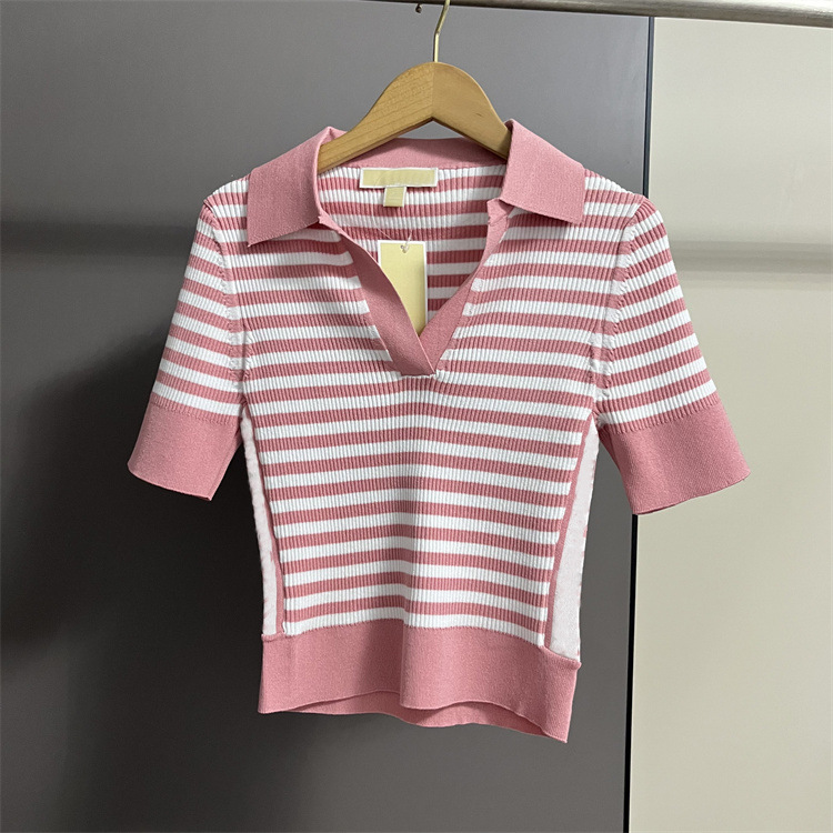 7889 Women’s Contrast Color Striped Knitted Lapel Short-sleeved Fashionable Jingdian Girl’s Age-reducing All-match No-pick Knitted Sweater