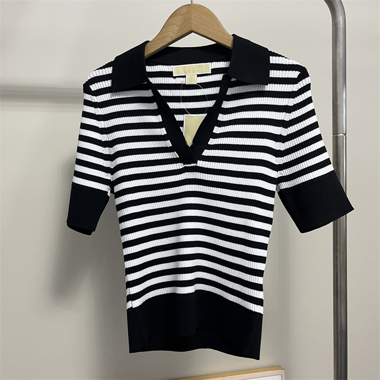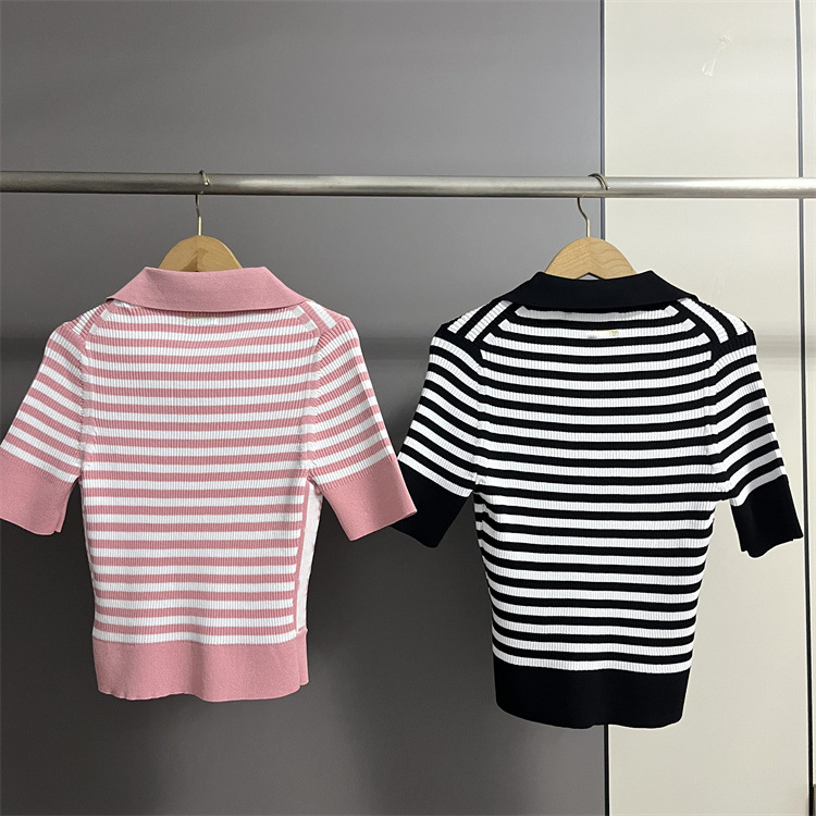 7889 Women's Contrast Color Striped Knitted Lapel Short-sleeved Fashionable Jingdian Girl's Age-reducing All-match No-pick Knitted Sweater