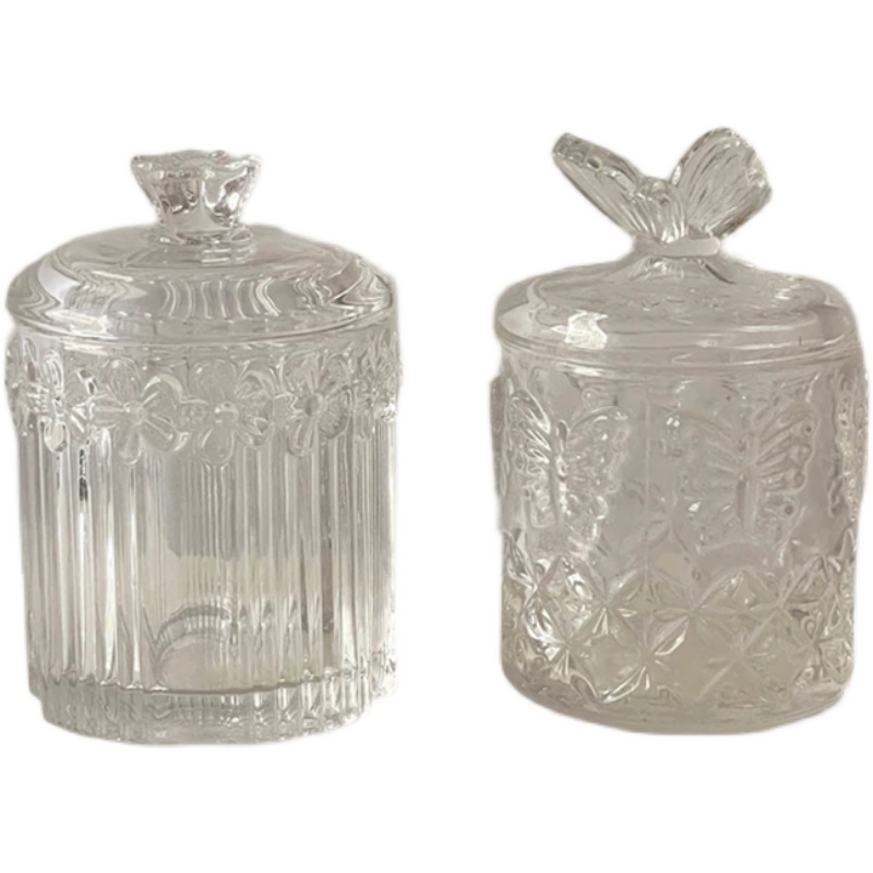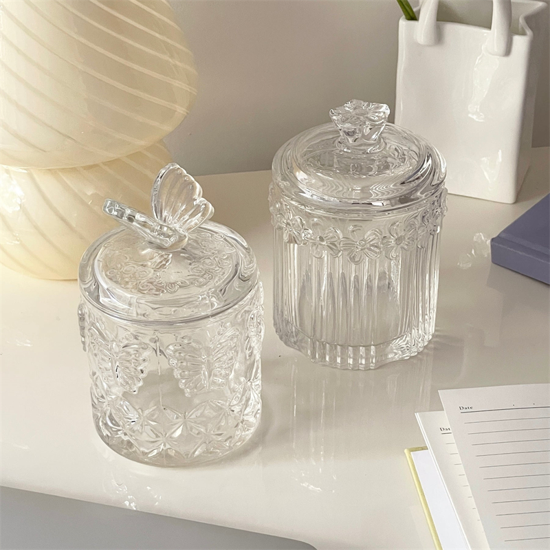 | nameOriginal | 7Mins embossed glass flower storage box candy jar jewelry cotton swab toothpick box butterfly lid pen holder coffee jar |