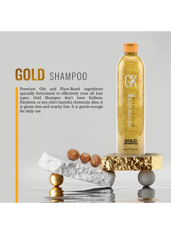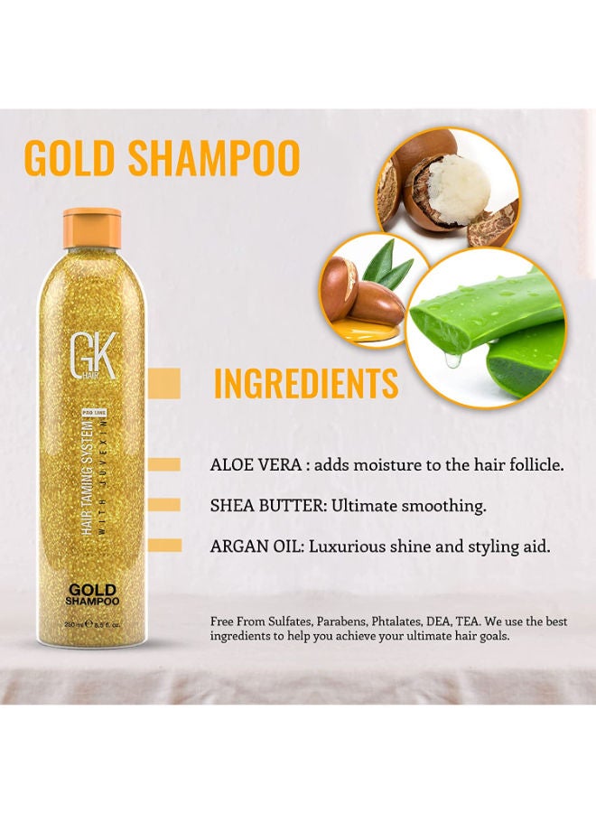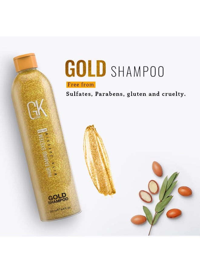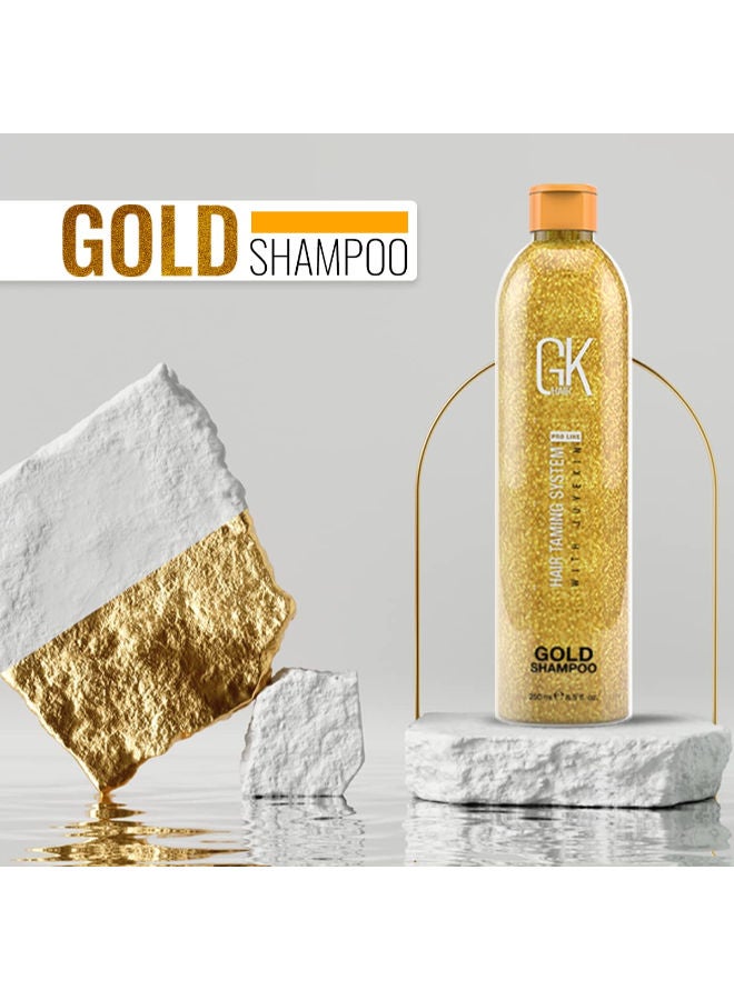 Introducing our luxurious Gold Shampoo, the perfect addition to your hair care routine. This 8.5 fl. Oz. / 250 ml bottle is packed with nourishing ingredients that will leave your hair feeling soft, shiny, and healthy. Infused with real gold particles, this shampoo will give your hair a radiant glow and a touch of glamour. The gentle formula is suitable for all hair types and is free from harsh chemicals, making it safe for daily use. With regular use, our Gold Shampoo will help to strengthen and protect your hair from damage, leaving you with luscious locks that are sure to turn heads. Treat yourself to the ultimate hair care experience with our Gold Shampoo.