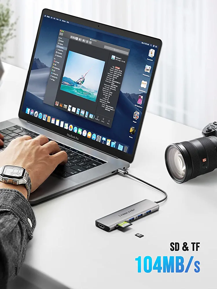 In addition, the Lemorele USB-C Hub includes a USB 3.0 5Gbps port, which can be used to connect external devices such as a mouse, keyboard, or external hard drive. The adapter also features an SD/TF card reader, making it easy to transfer files from your camera or other devices.