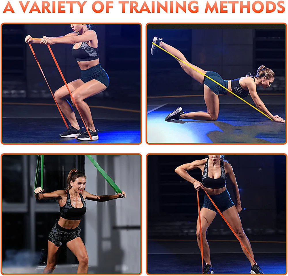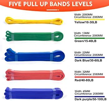 Our pack of 5 resistance bands comes in different colors and sizes, ranging from 8-60lbs, to meet your different needs. You can use these bands to perform various exercises such as rows, pulls, raises, and fly workout sets to target different muscle groups in your arms, back, hips, legs, chest, and abdominal region.