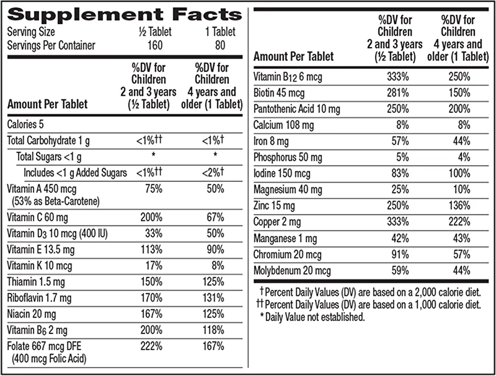Centrum Kids is a chewable multivitamin supplement that provides essential nutrients for healthy growth and development in children over two years old. With more vitamins and minerals than any other leading brand, this non-GMO multivitamin helps fill nutritional gaps and supports immunity with antioxidants like Vitamins A, C, and E. Available in three delicious flavors – Cherry, Orange, and Fruit Punch – these easy-to-chew tablets are perfect for kids. Centrum Kids is backed by 30 years of nutritional expertise and science, making it the number one doctor-recommended multivitamin brand. Each bottle contains 80 tablets, and children aged 2-3 should take half a tablet daily with food, while children aged 4 and older should take one tablet daily with food. If your child is taking medication, consult your pediatrician before use. Satisfaction is guaranteed, and if you are not satisfied with the product, GSK Consumer Healthcare will provide a reimbursement within 45 days of purchase.