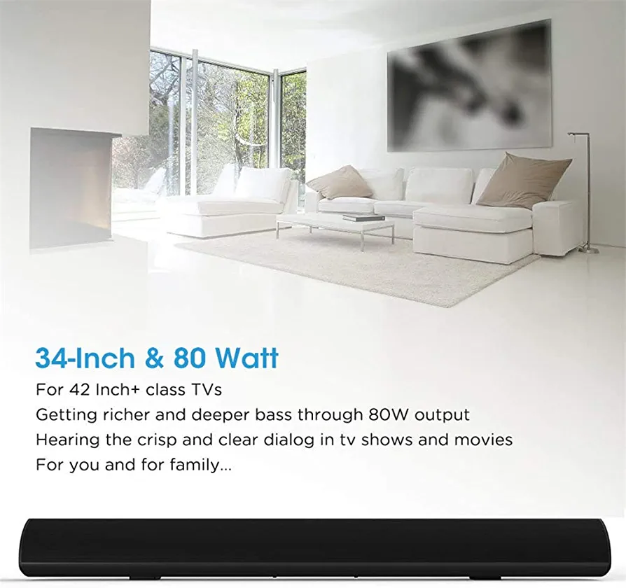 Enhance your TV viewing experience with this sound bar that can be easily controlled using your TV or cable remote. Designed for 42 inch+ class TVs, it delivers rich and deep bass with an output power of 80W, ensuring clear dialogues in TV shows and movies. The sound bar is wired and easy to install, and its plastic cabinet material gives it a sleek and modern look that blends seamlessly into any room. With 2 channels and no support for memory cards or display screens, this sound bar is perfect for those who want superior sound quality without any unnecessary features. The package includes one sound bar, and if you have any questions, our customer service team is available 24/7 to provide you with a satisfactory answer. Transform your home into a movie theater with this astonishing sound bar.