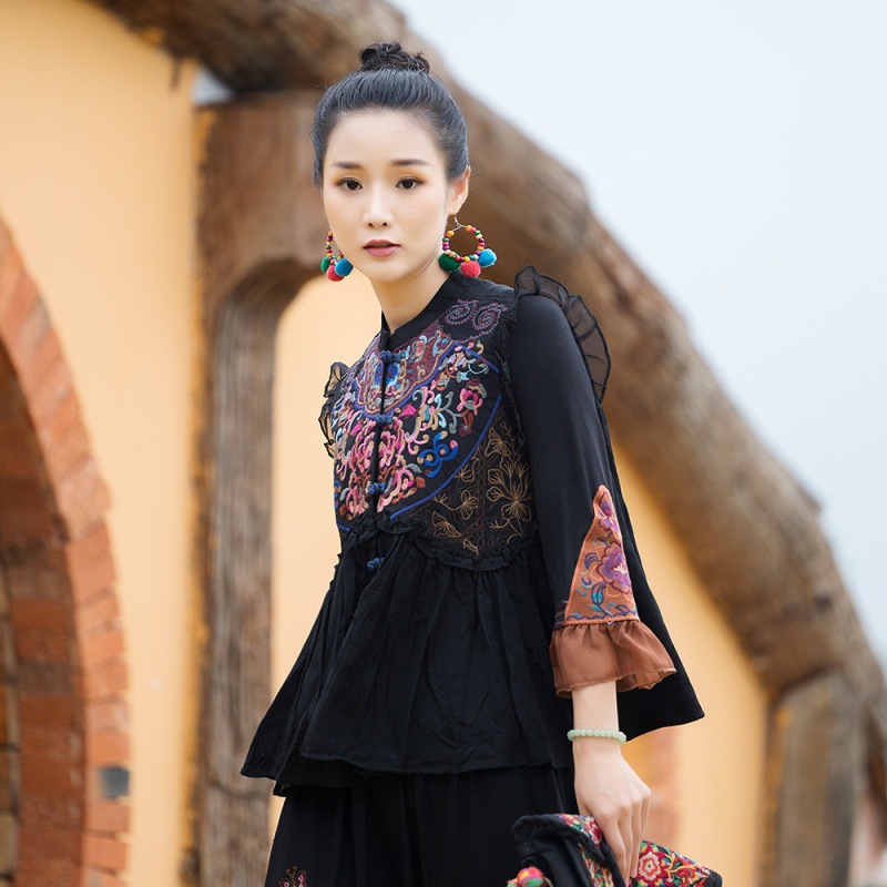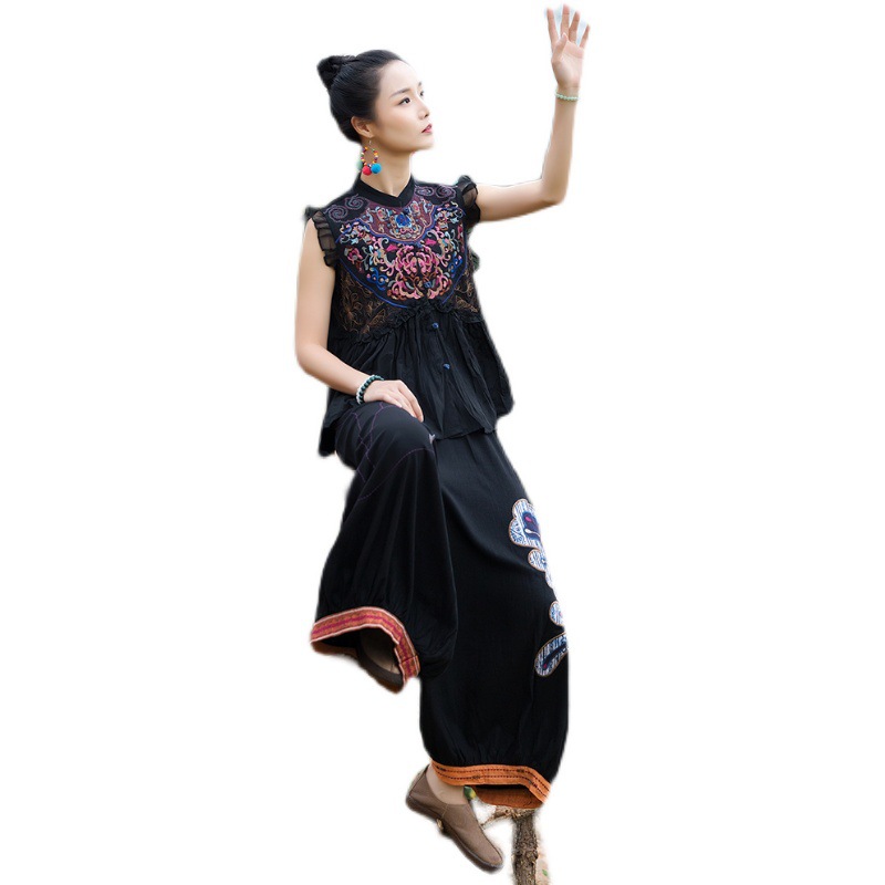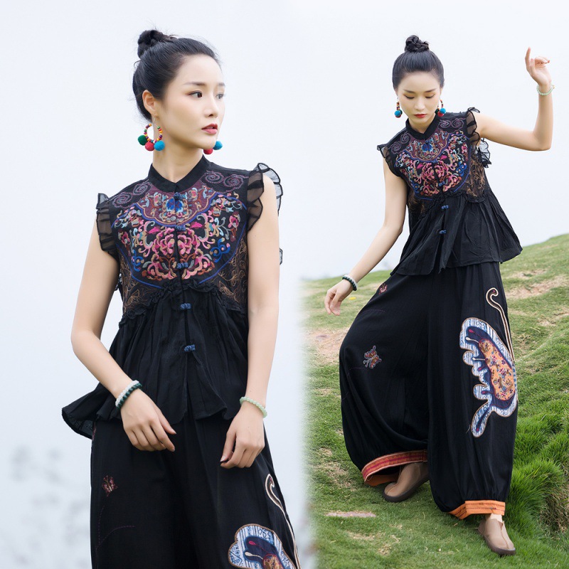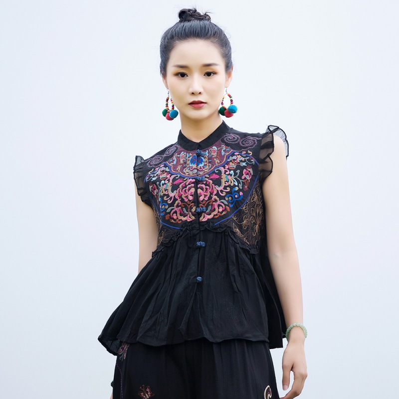 8792 Real Shot Ethnic Style Embroidery Buckle Vest Short Sleeveless Top Overshirt Waistcoat Short Sleeve