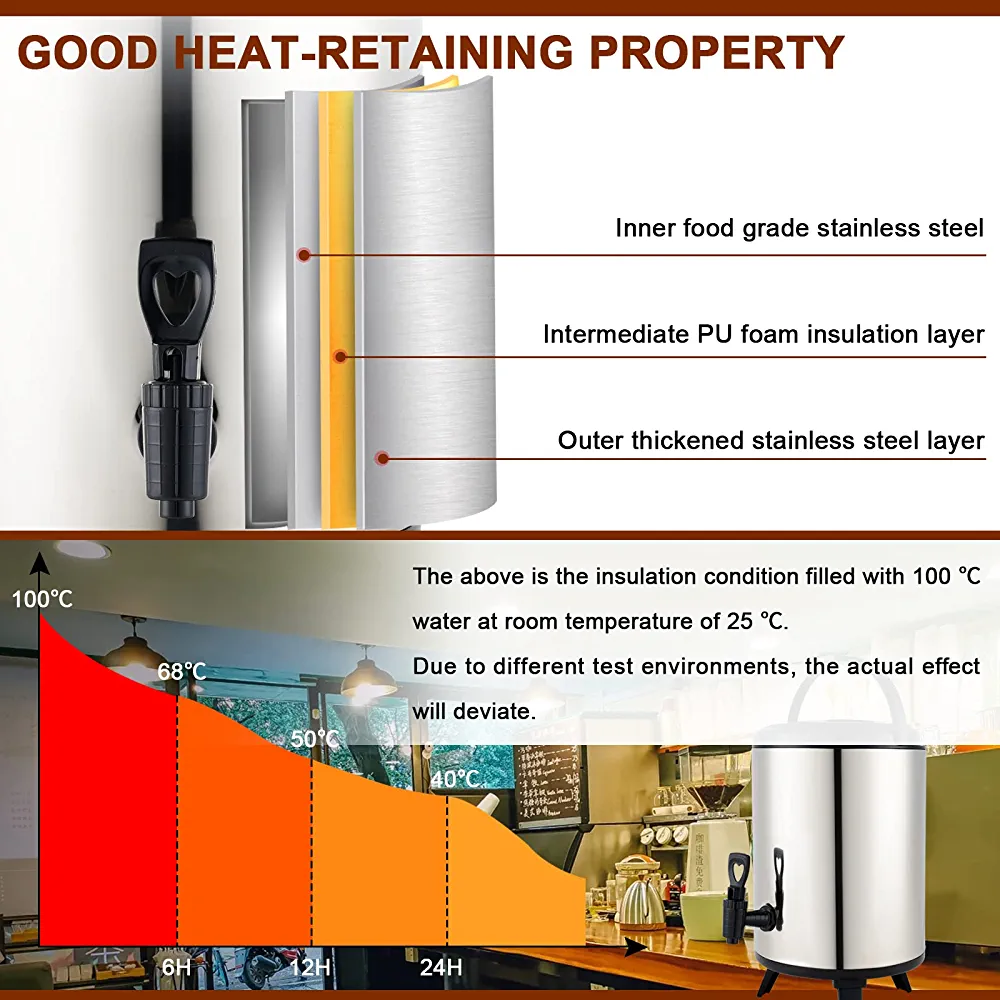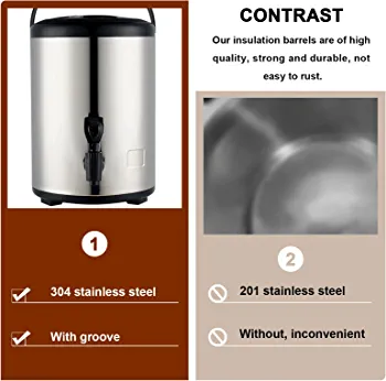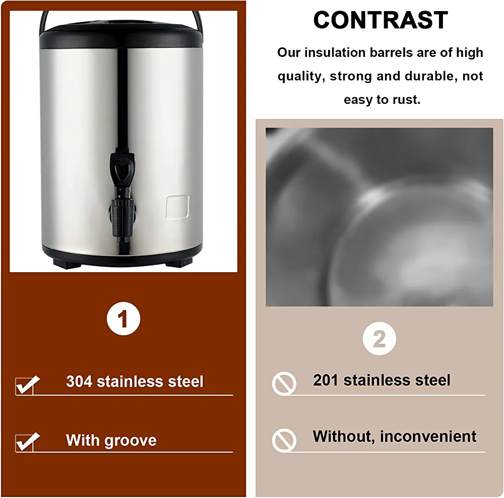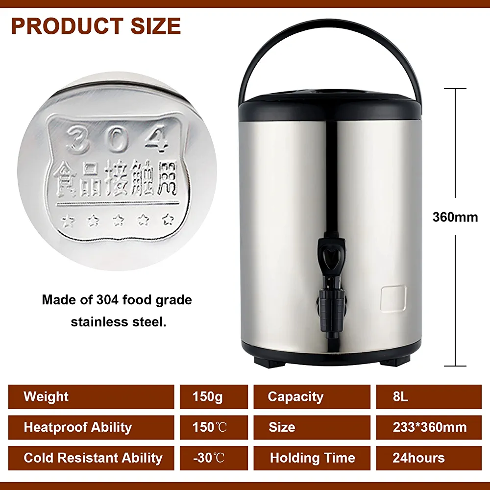 Introducing our Food Grade Stainless Steel Insulated Beverage Dispenser, the perfect addition to your home or office for serving hot or cold beverages. With a capacity of 8L or 2.1 gallons, this dispenser is perfect for serving hot tea, coffee, cold milk, water, or juice. The 304 stainless steel construction ensures durability and longevity, while also being food grade safe. The insulated thermal design keeps your beverages at the perfect temperature for hours, making it ideal for parties, events, or daily use. The easy-to-use spigot allows for effortless dispensing, while the sleek and modern design adds a touch of elegance to any setting. Upgrade your beverage serving game with our Food Grade Stainless Steel Insulated Beverage Dispenser.