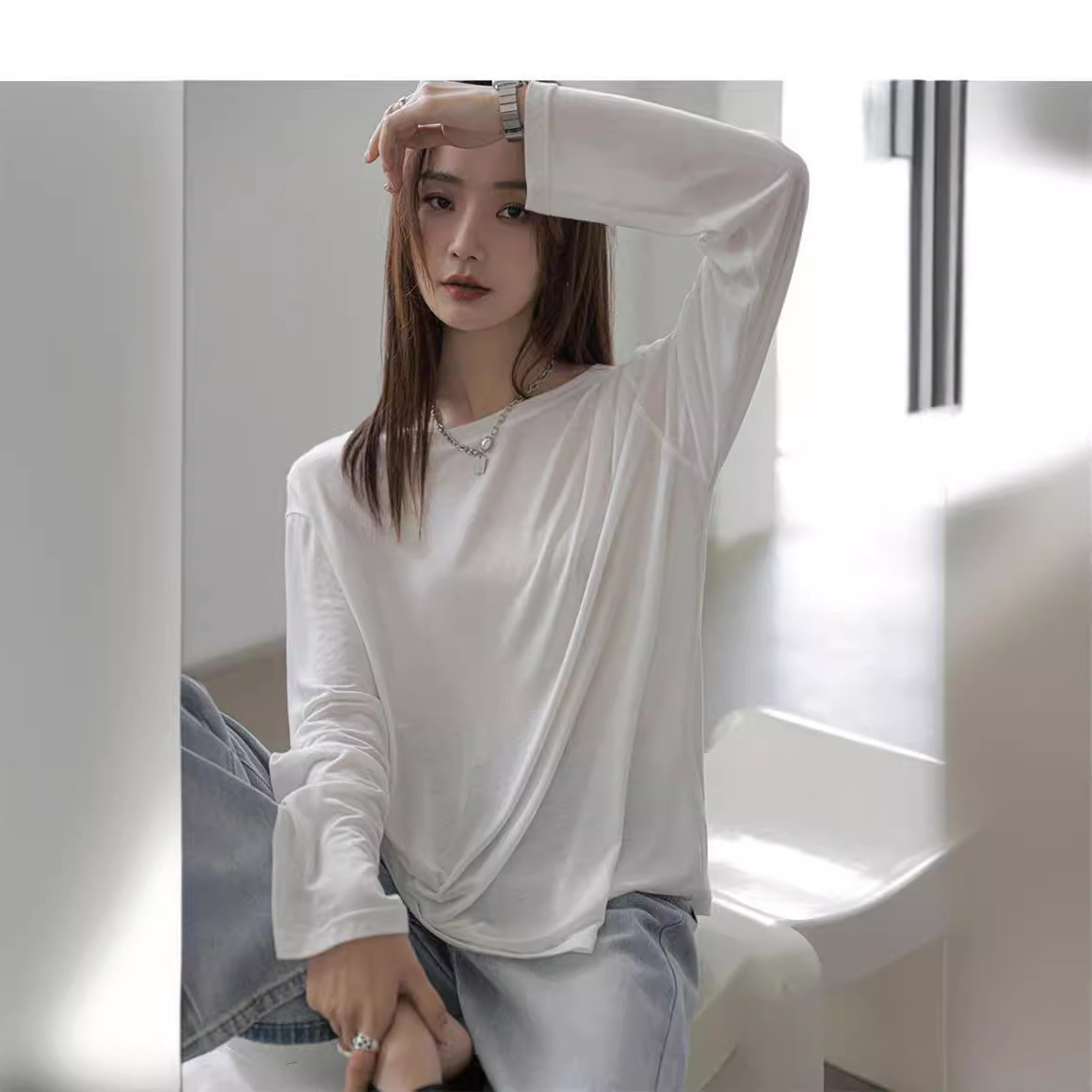 9002# Culottes with Lyocell Tencel Base Shirt Women’s Round Neck Thin Loose Korean Style All-match Sun Protection