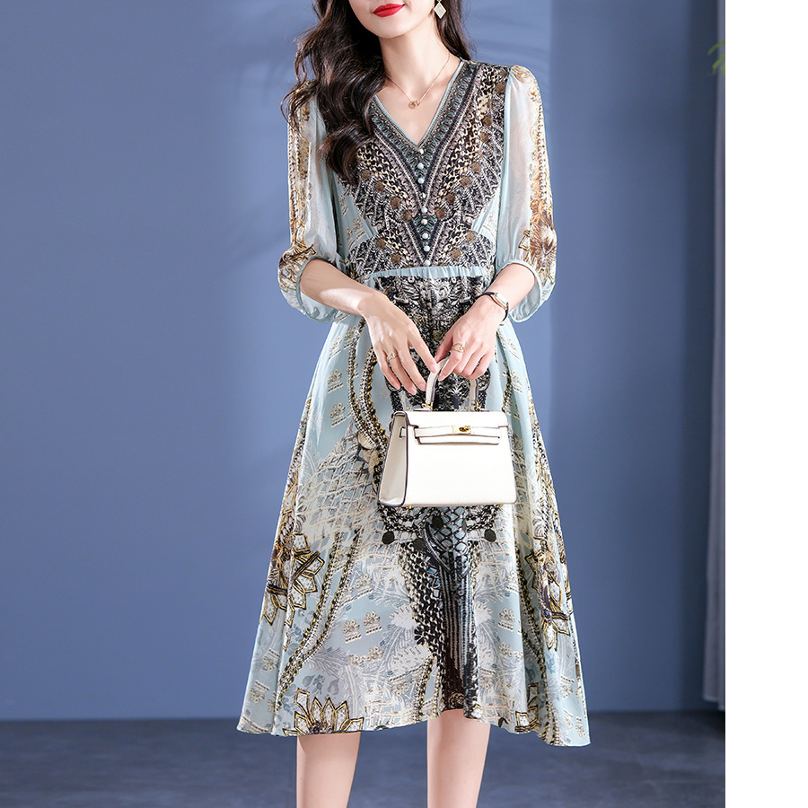 | nameOriginal | 90286 2024 new women's clothing positioning printed silk midi dress five-quarter sleeve elegant slimming dress |