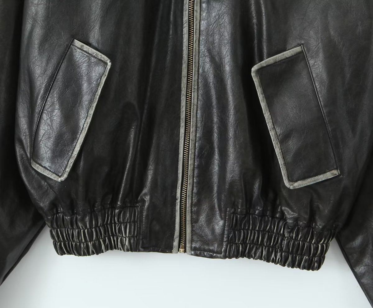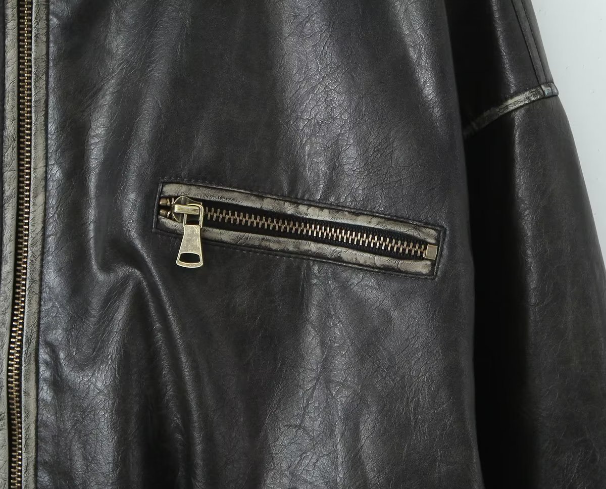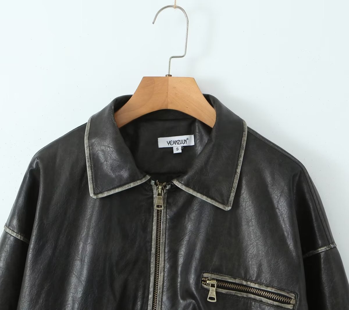 9141-23 Autumn new European and American style hot girl urban casual lapel long sleeve zipper brushed leather coat for women