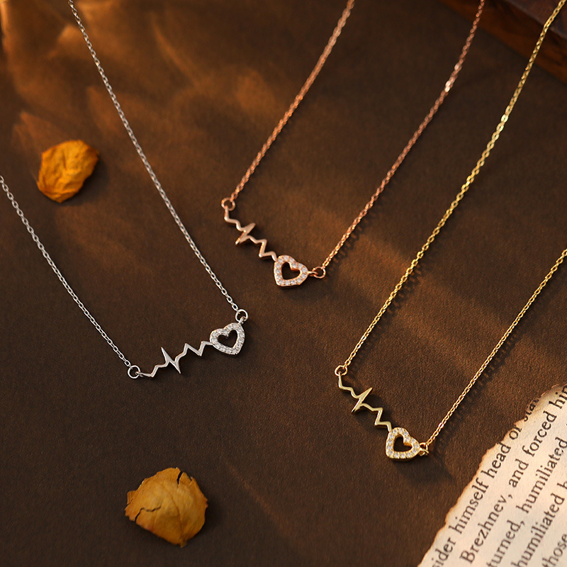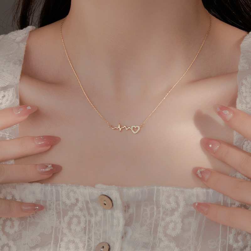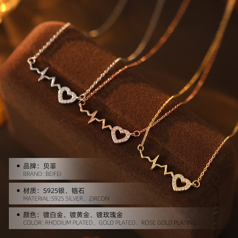 925 Sterling Silver Love Necklace Women's Summer Sweet Cyber Celebrity Light Luxury Zircon Clavicle Chain Heartbeat Design Fashion Accessories