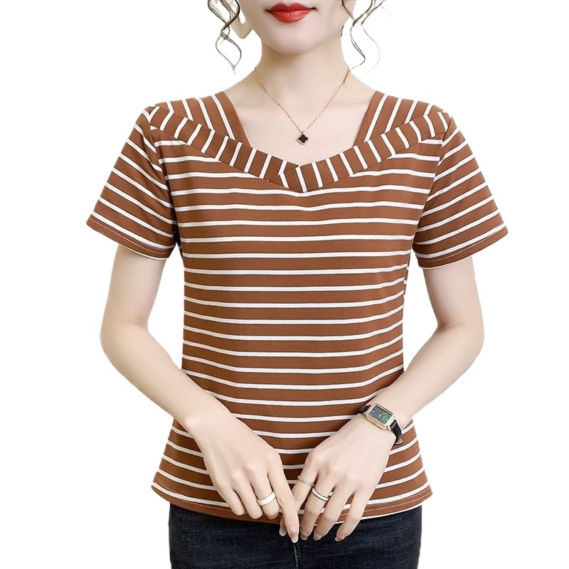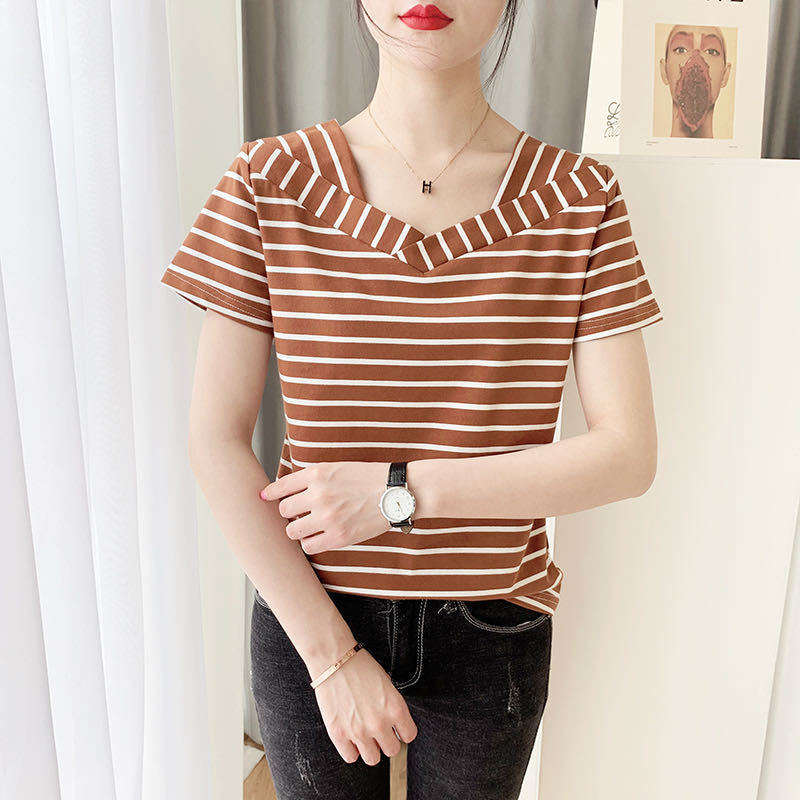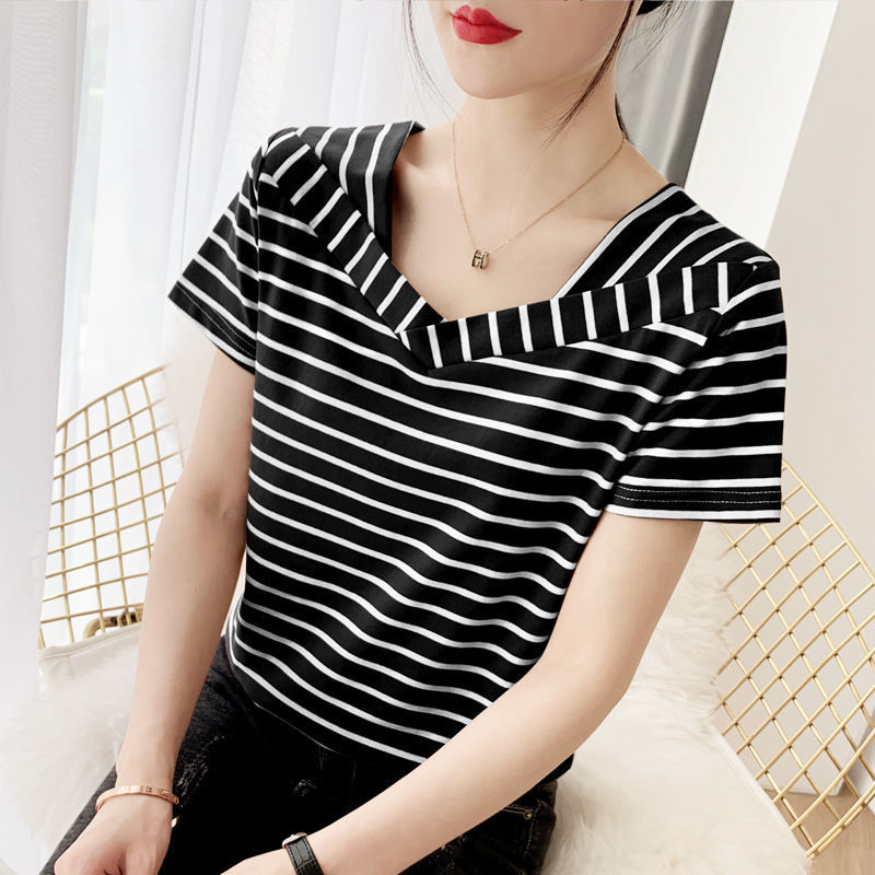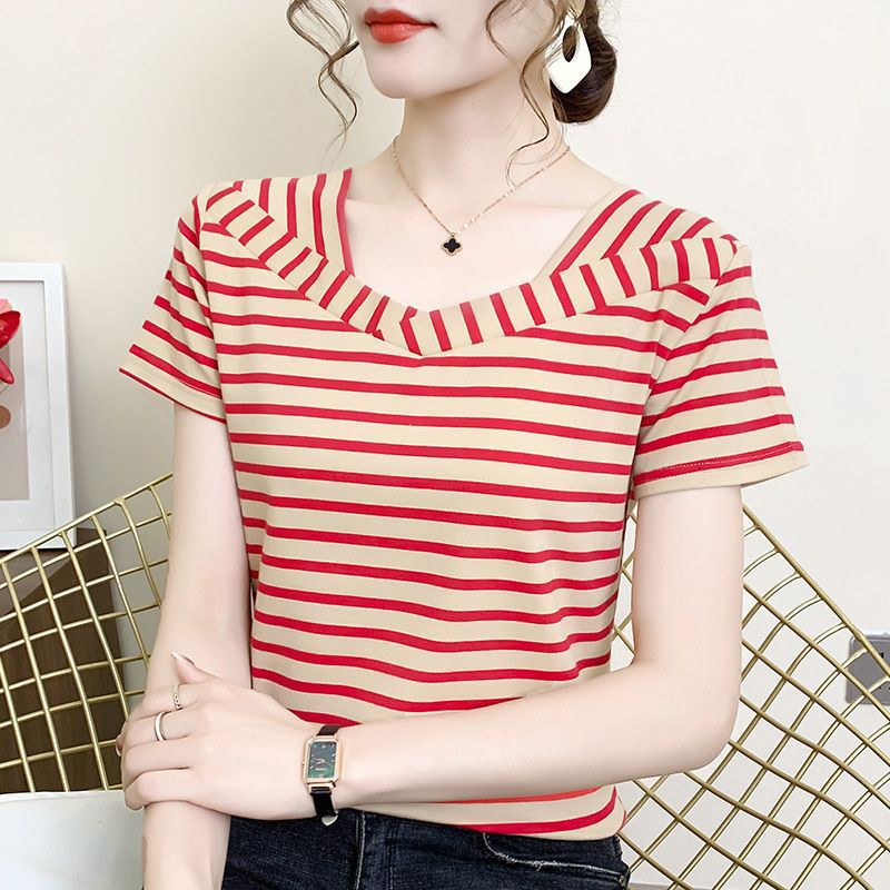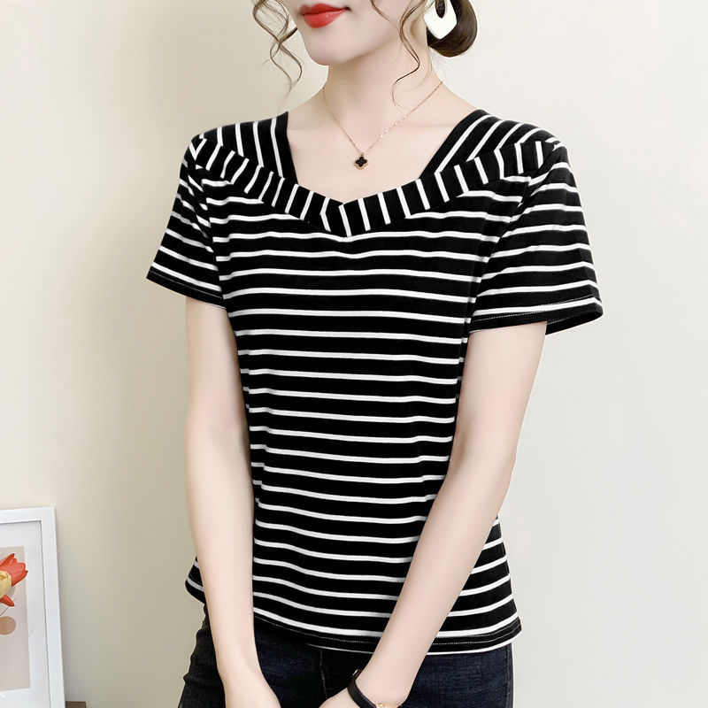 | nameOriginal | 95 Cotton Short-sleeved Women's 2024 New Summer Korean-style Collar Striped Top Slim-fit All-match Base-layer Shirt Half-sleeved Women |