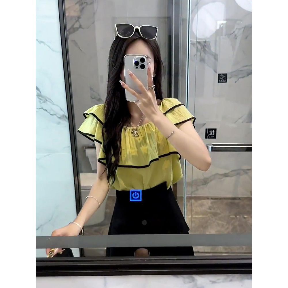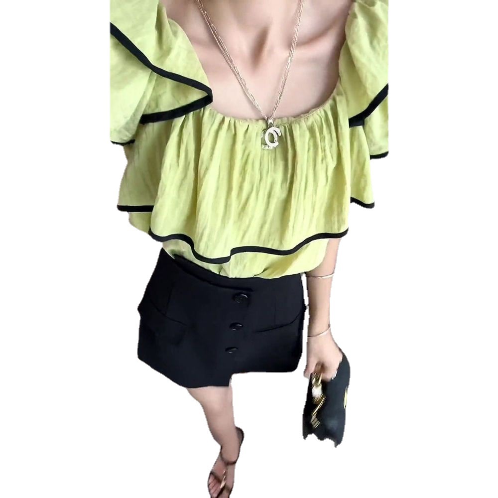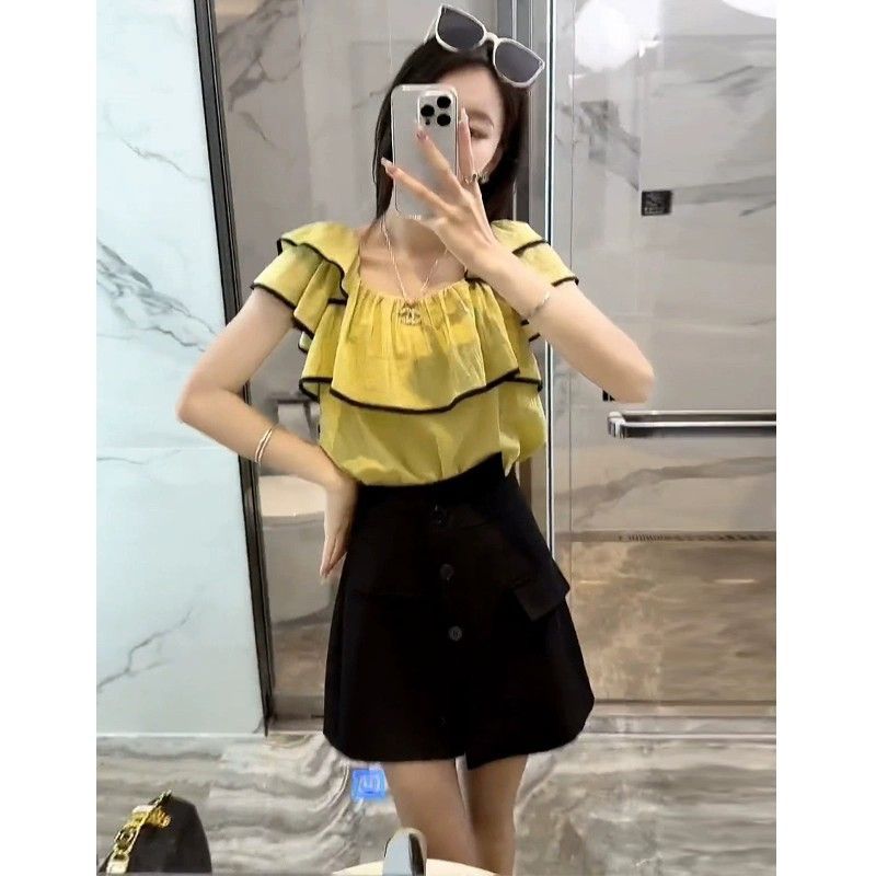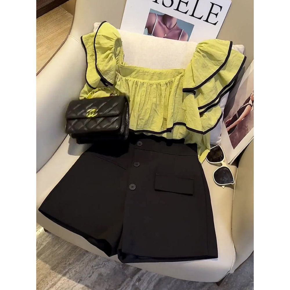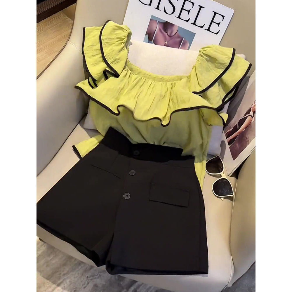 | nameOriginal | A complete set of ladies-style ruffled top compact top design irregular shorts suit for women |