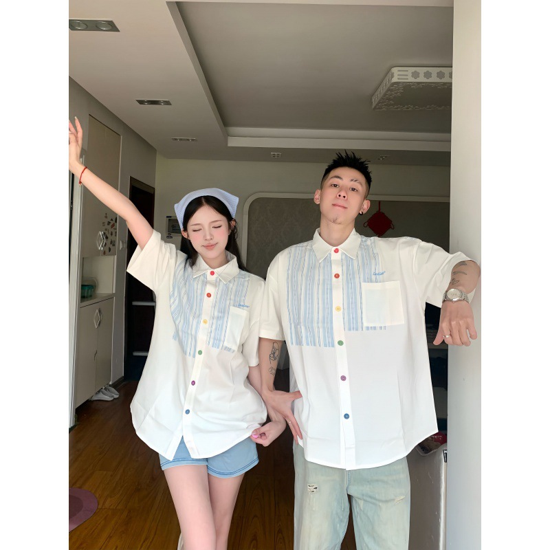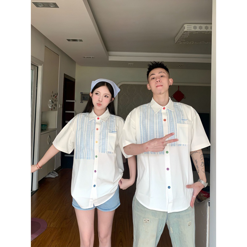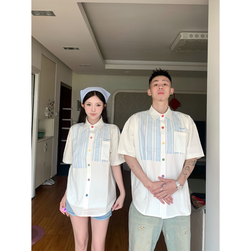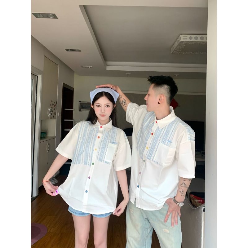 A generation of hair 2024 real shooting lovers men's and women's shirt summer stitching short sleeve shirt