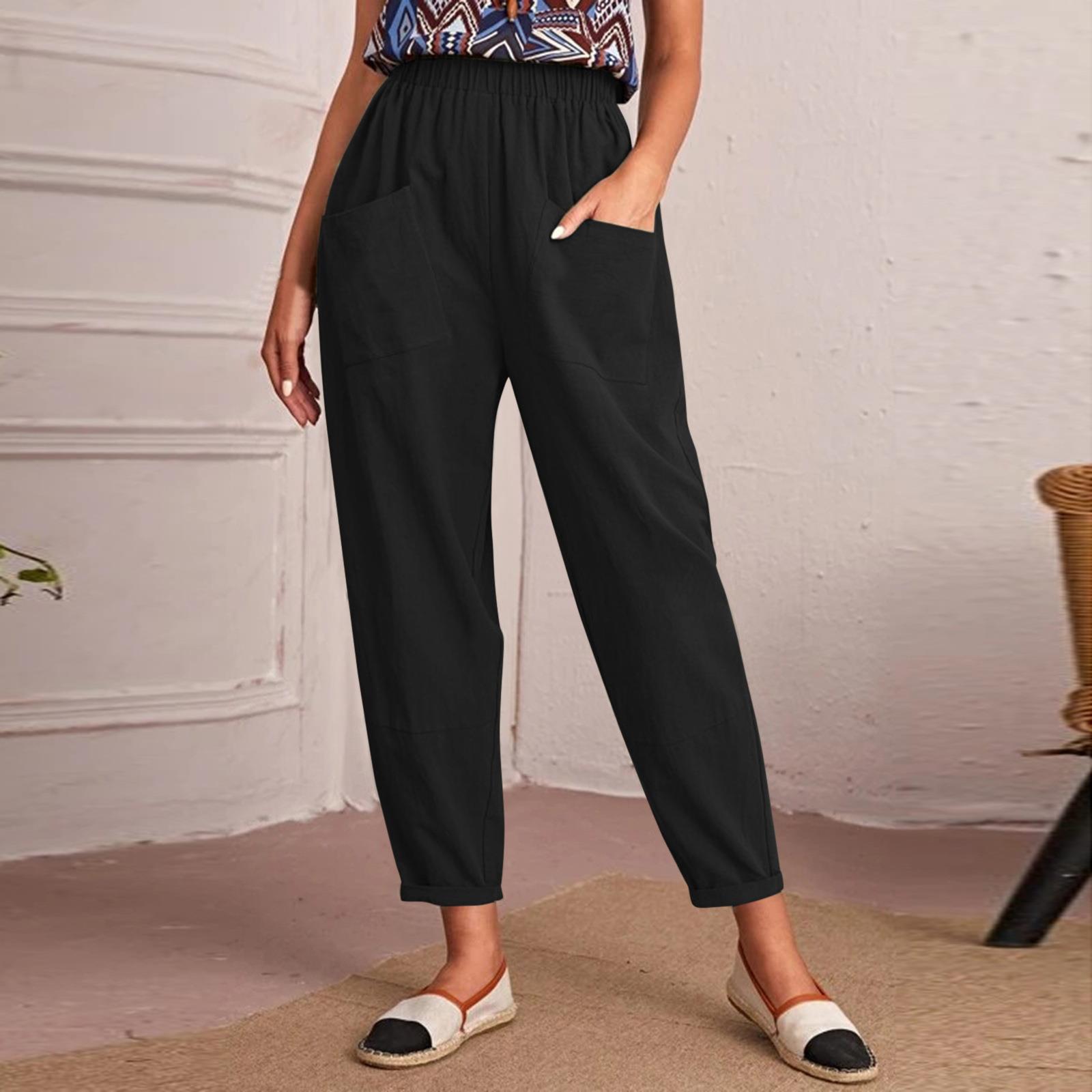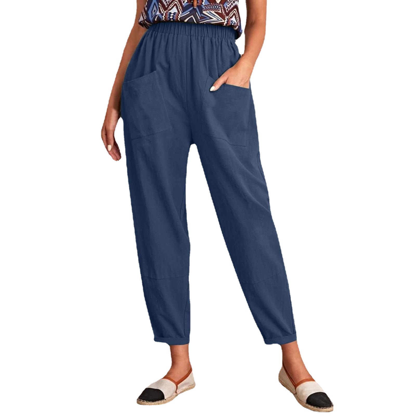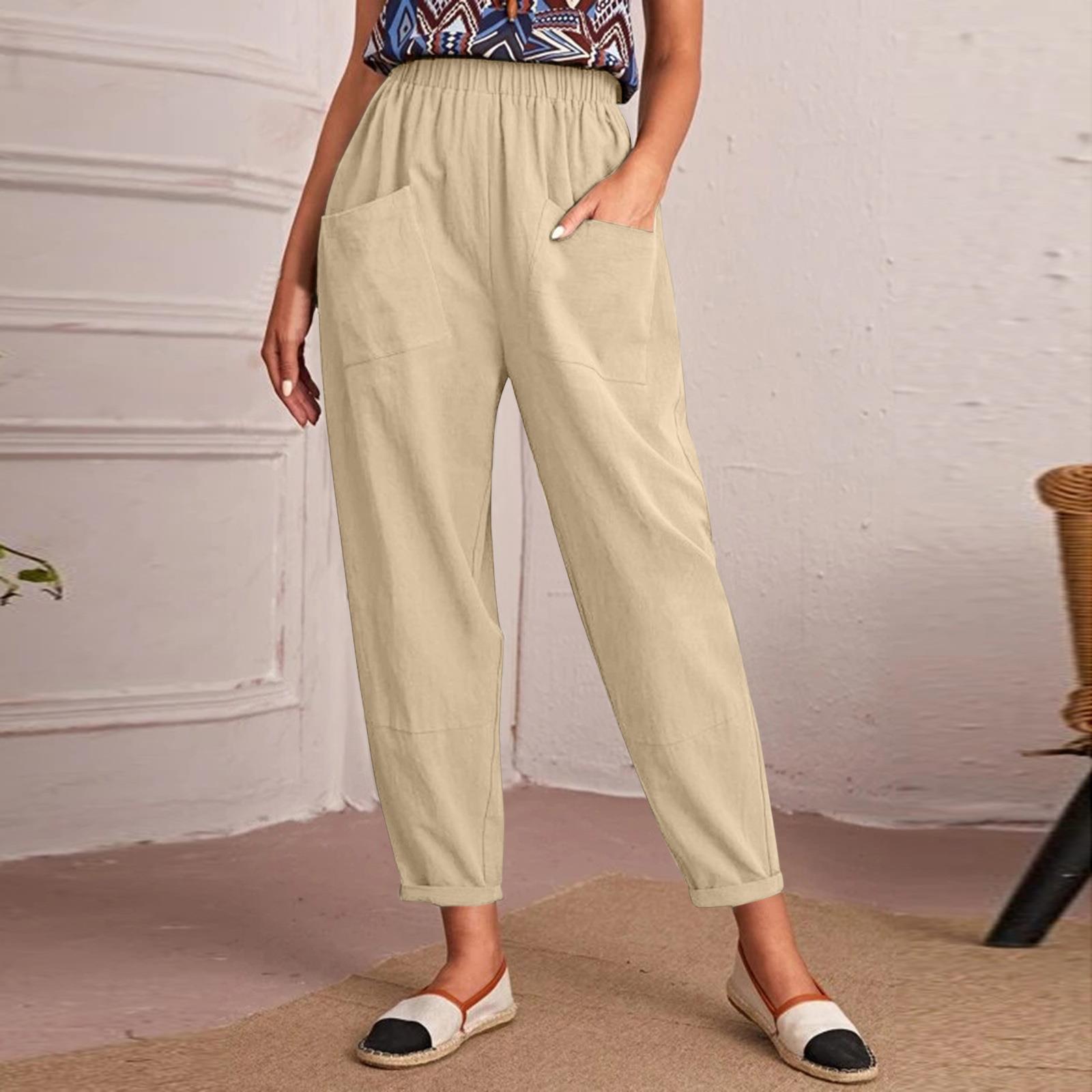 | nameOriginal | A large number of spot 2023 new European and American cross-border Amazon elastic waist cotton and linen oblique pocket nine feet leg women's pants |