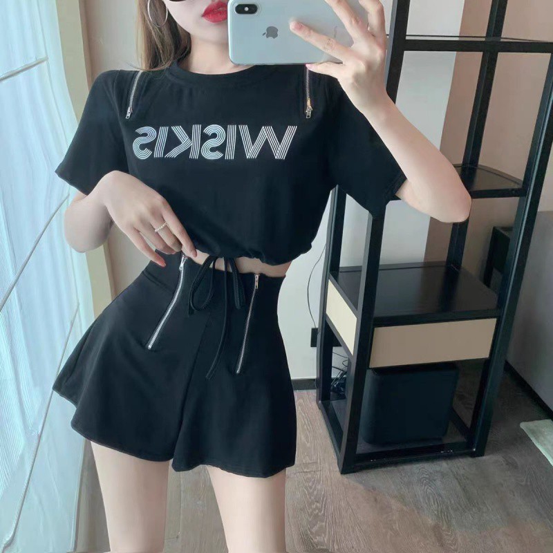 A Set of Summer New Fashionable Loose Shoulder Short Sleeve Top Women's Small Casual Sportswear Shorts suit