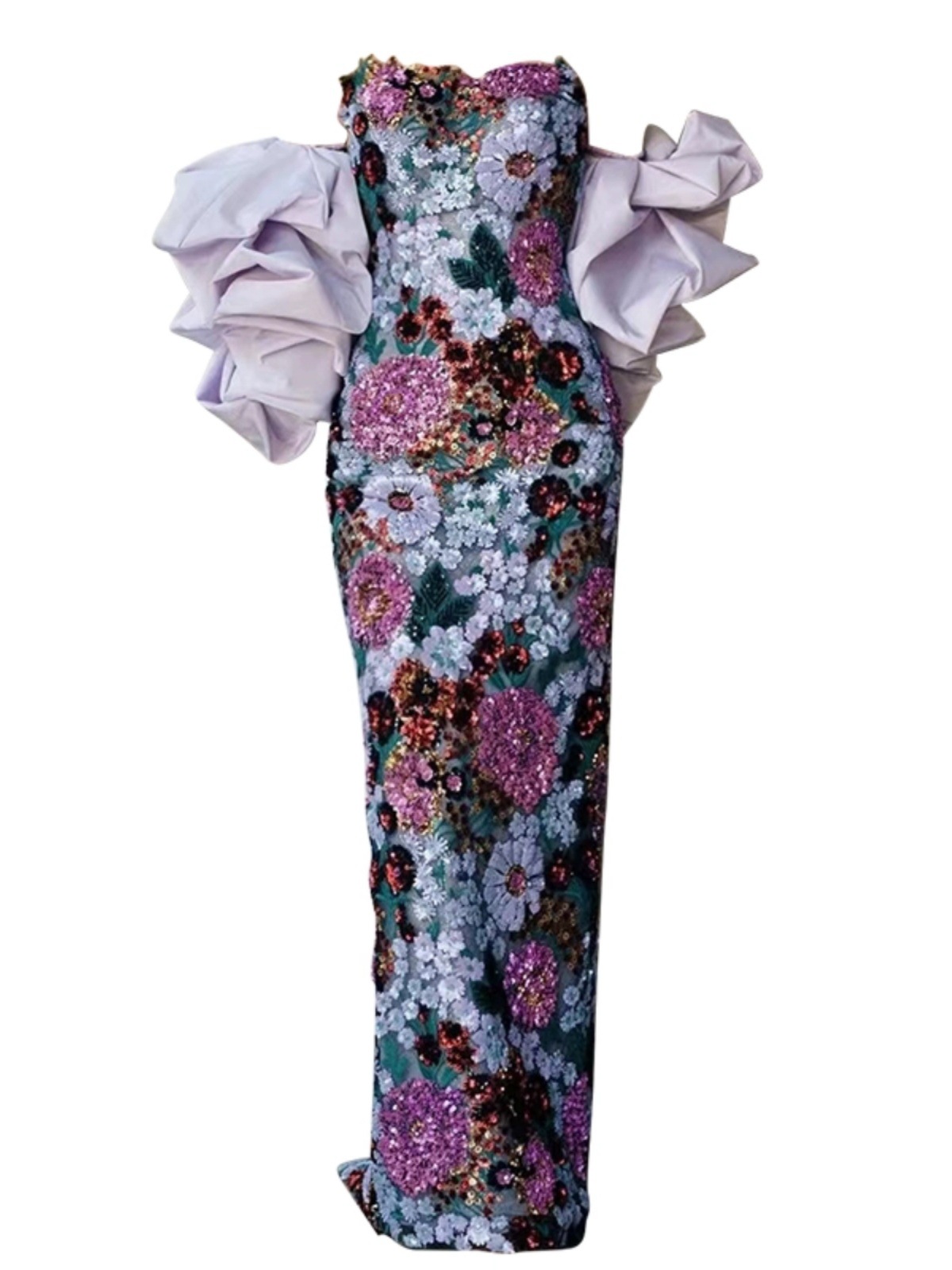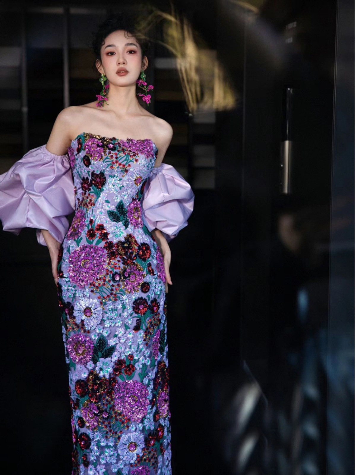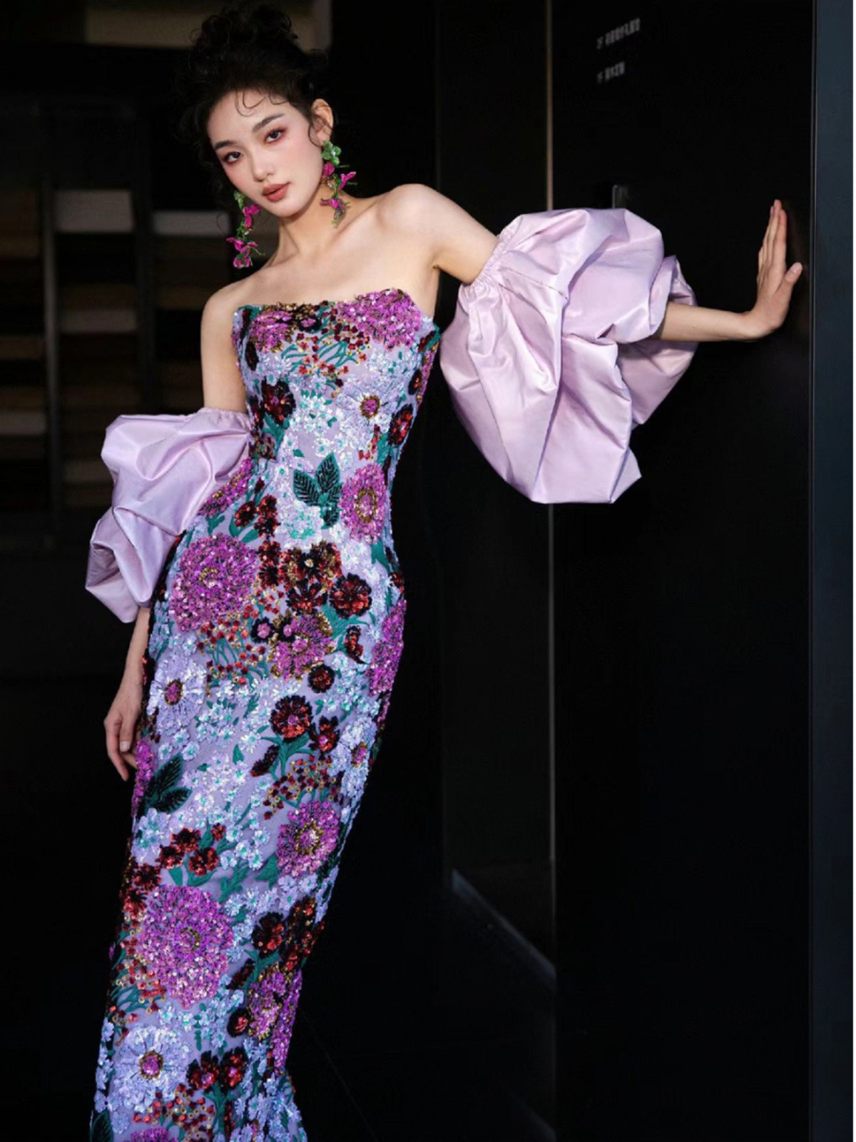 A two-wear purple flower bride wedding toast birthday party host wedding evening dress 19881