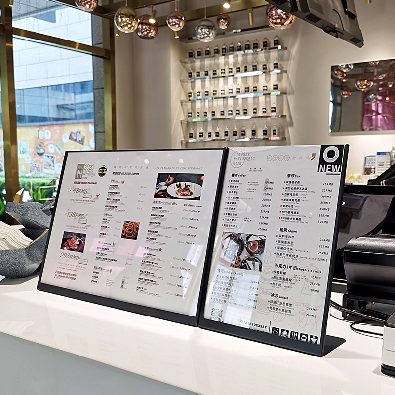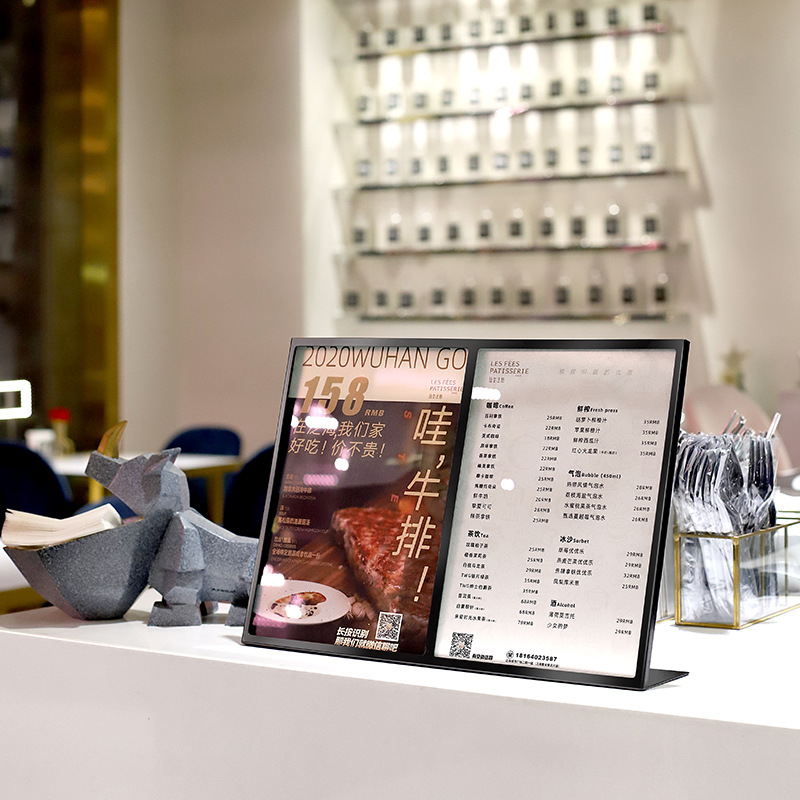 | nameOriginal | a4 metal table card desktop bar design milk tea shop stainless steel menu shelf price display card dining card KT board |