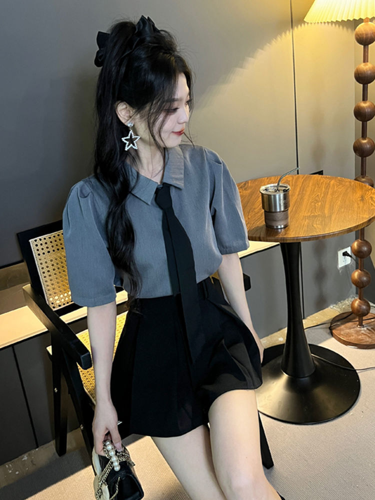 | nameOriginal | Academy Style Loose Simple Casual Short Sleeve Polo Collar Tie Puff Sleeve Short Shirt Top Overskirt suit |