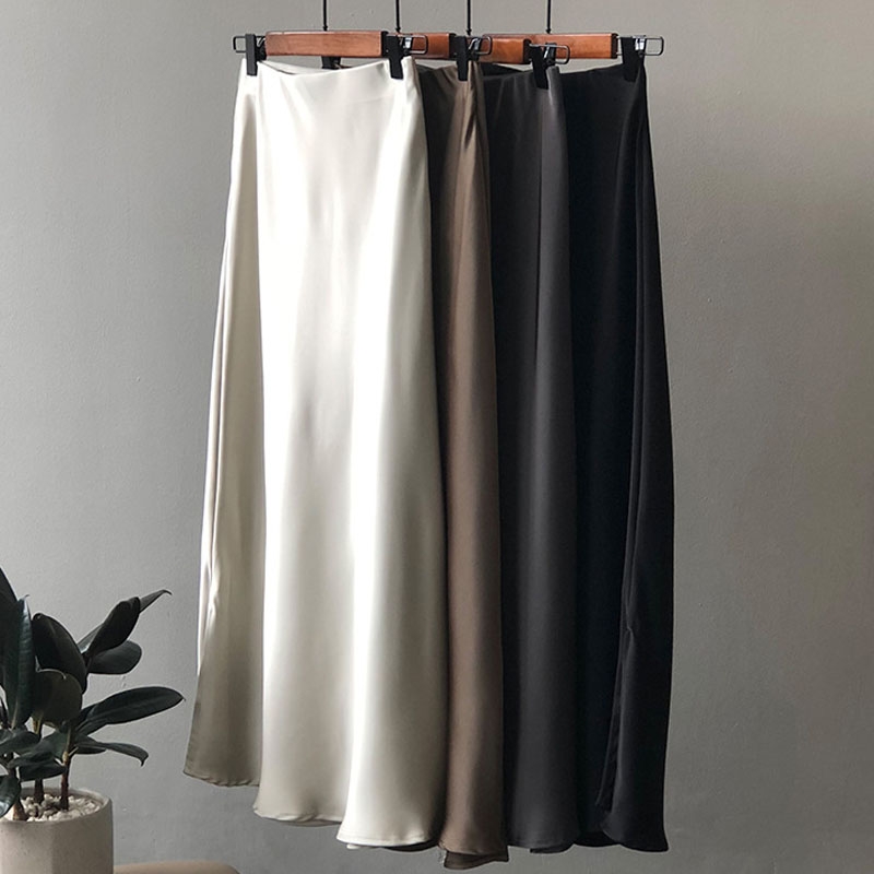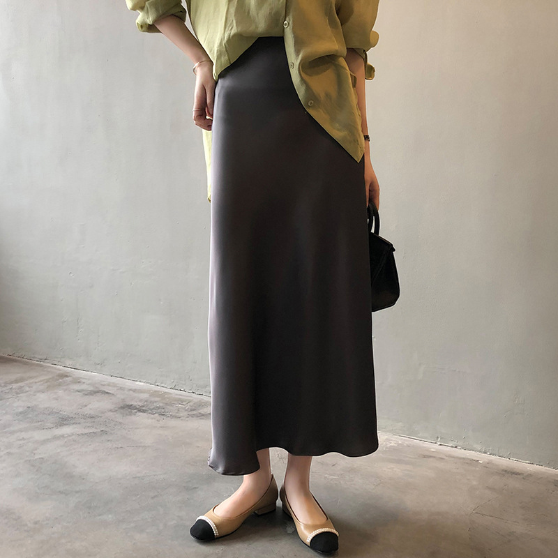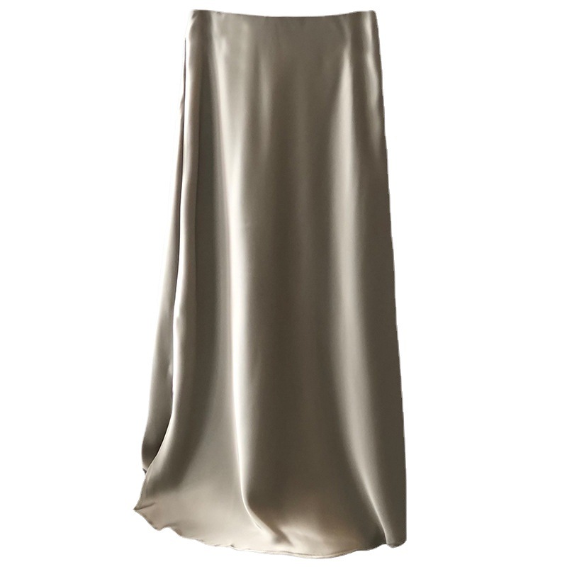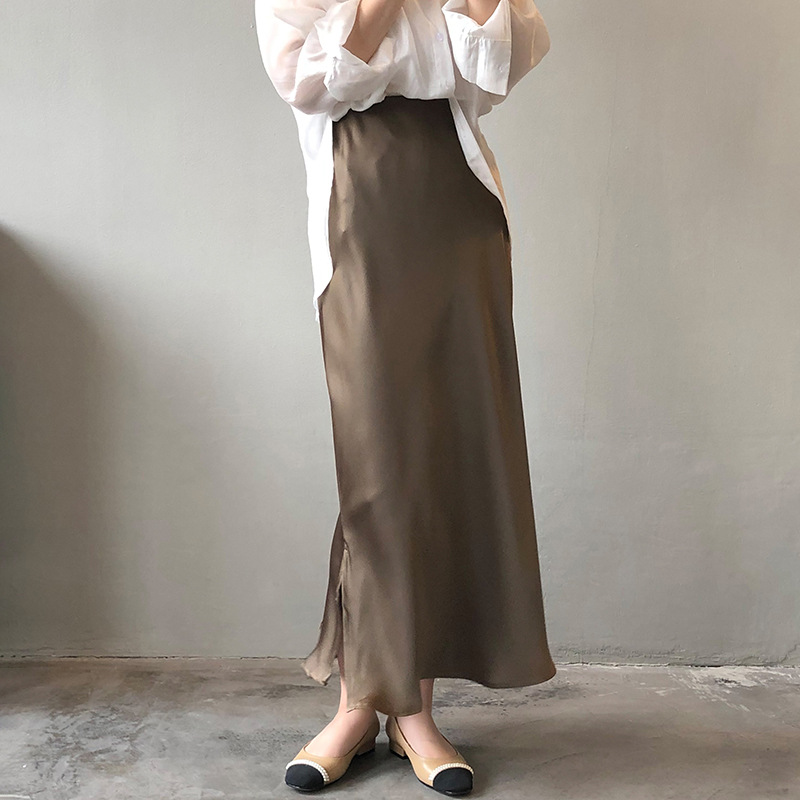 Acetic Acid Satin Skirt Women’s Spring and Autumn Summer Korean-style A- line Split High Waist Hip Wrap Dipped Small Mid-length Skirt