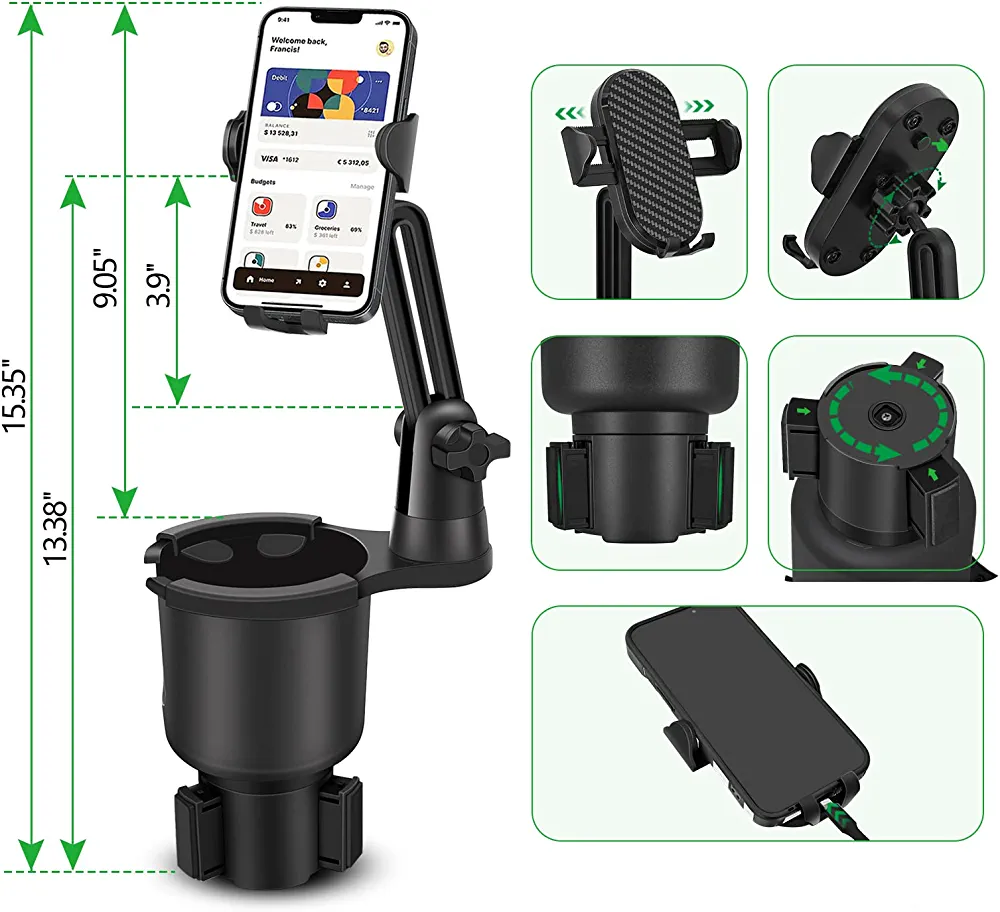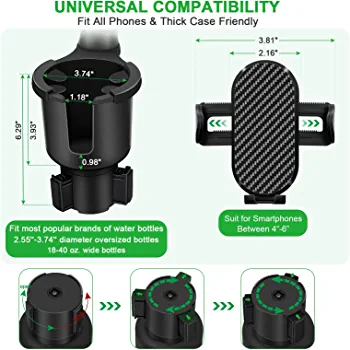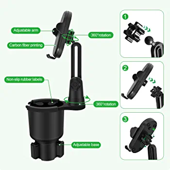 The 2 in 1 Cup Phone Holder is the most useful feature of the holder as it can hold your phone while holding your cup. The base of the cup holder phone mount tightens to secure the phone in your car cup holder, and the cup phone holder swivels freely to the position you prefer. When you need to use GPS during the journey, this holder can easily check the GPS direction without using your hands.