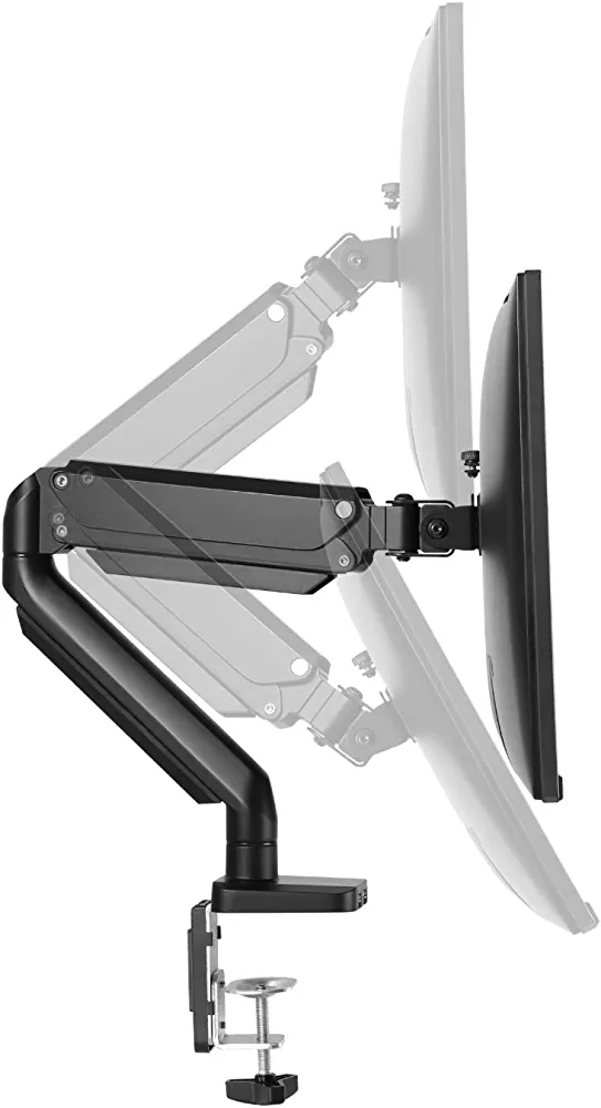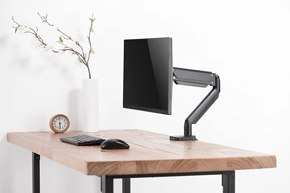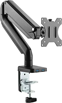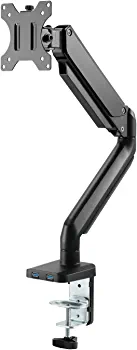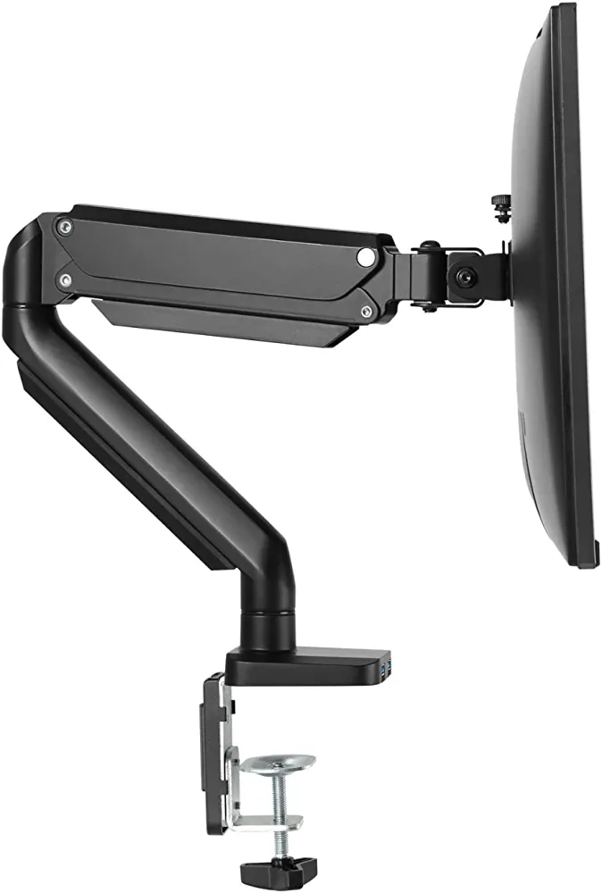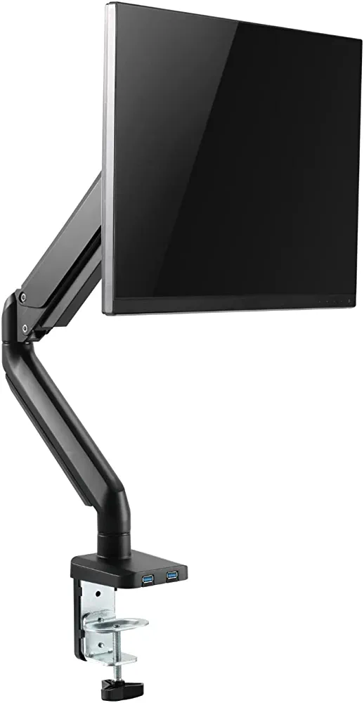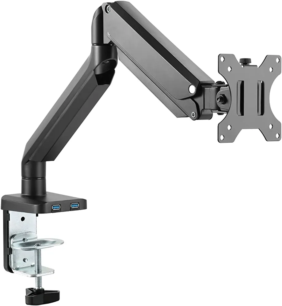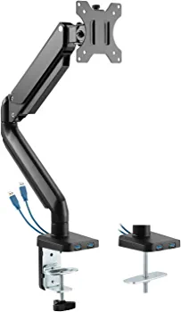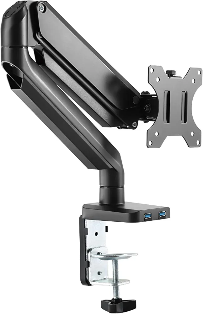 Adjustable single monitor desk mount for 17″-32″ screens with USB 3.0 and cable management. Can be mounted with VESA, C-clamp, or grommet. Made of durable die-cast aluminum with a gas spring for easy adjustments.