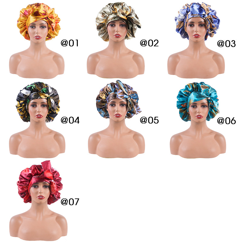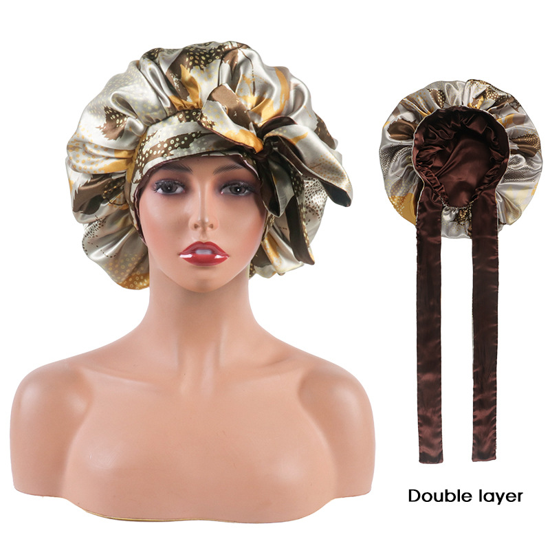 African leaves printed elastic long lace-up double-layer wig cap satin headscarf cap silk nightcap