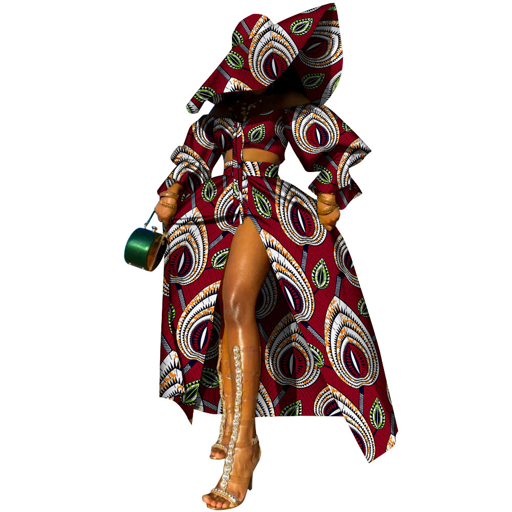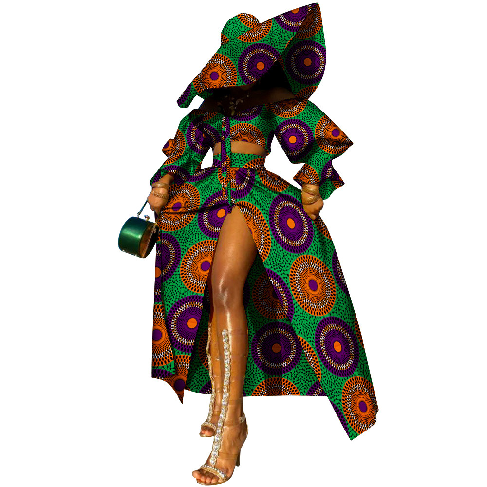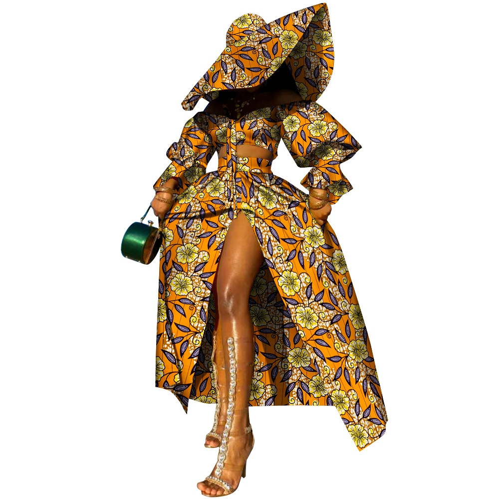| nameOriginal | African Women's Clothing Printed Crop Top and Split Skirt Big Beach Hat Three-Piece Costume Party Skirt |