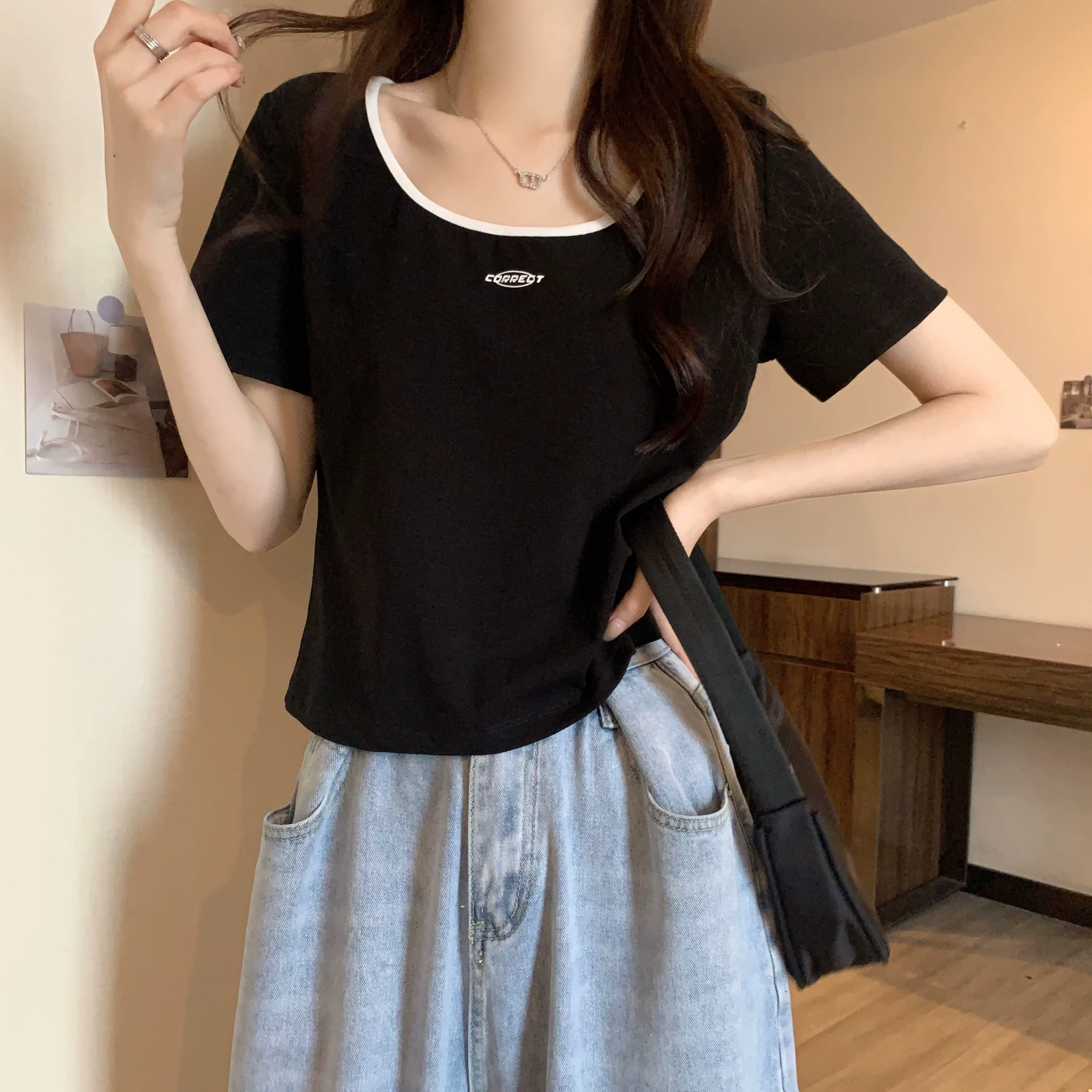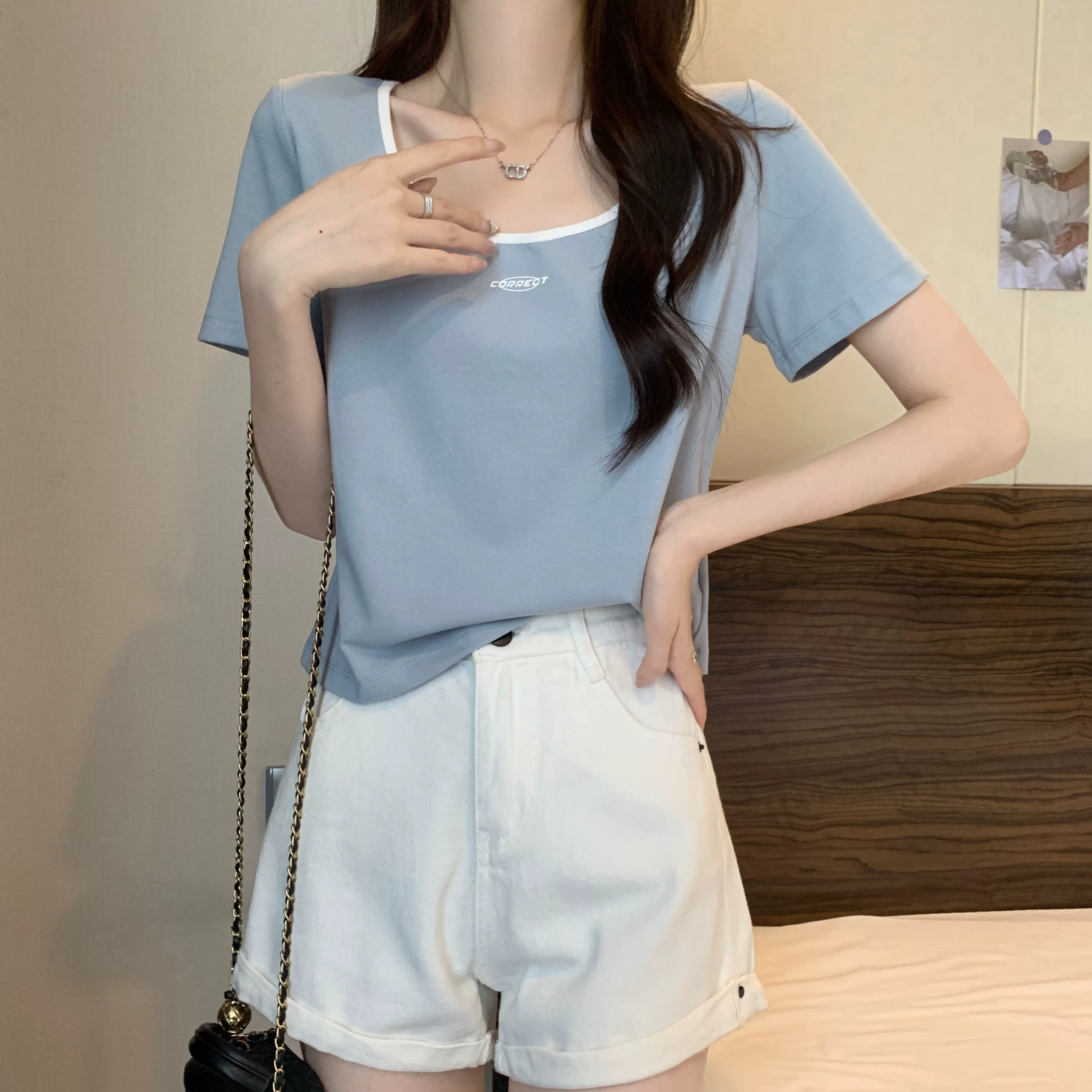 | nameOriginal | Age-reducing Contrast Color Square Neck Right Shoulder Top Short Sleeve T-Shirt |
