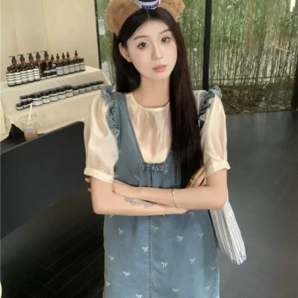 | nameOriginal | Age-reducing denim dress with loose bow print |