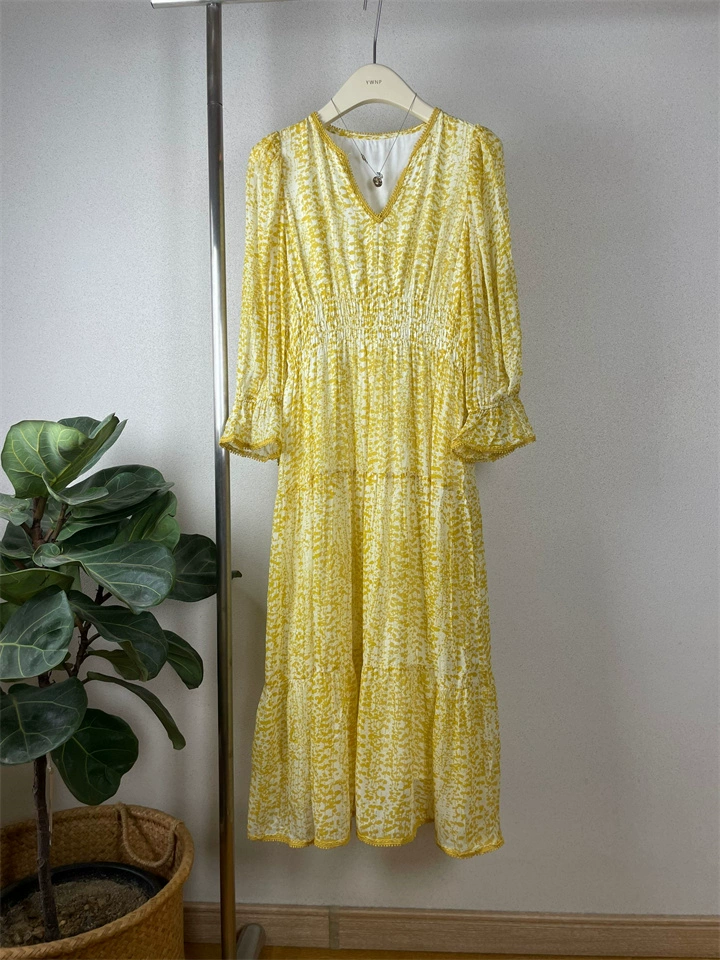 | nameOriginal | Age-reducing lemon yellow elegant V-neck dress with lace |