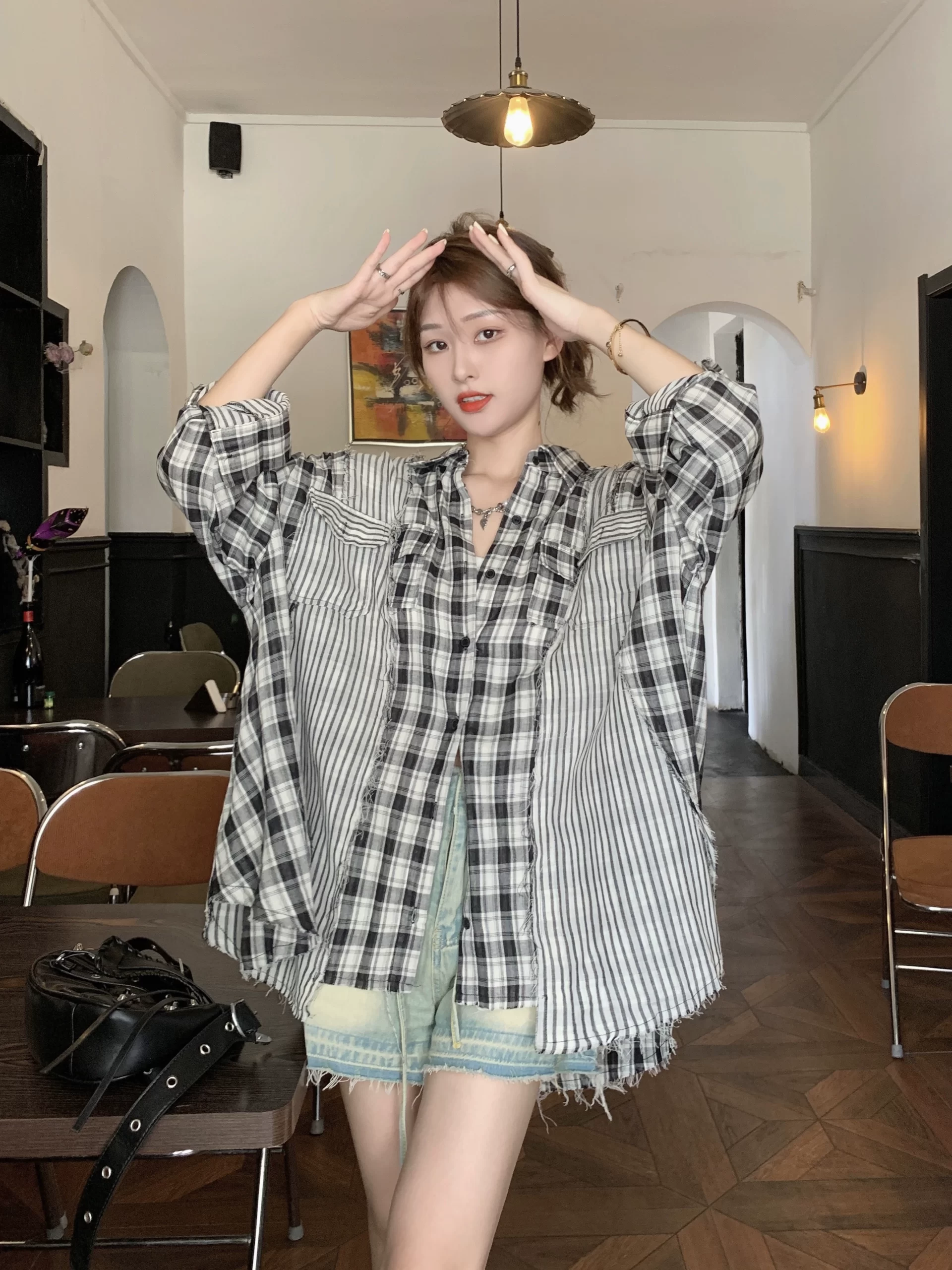 | nameOriginal | Age-reducing plaid splicing beautiful fat girl loose shirt |