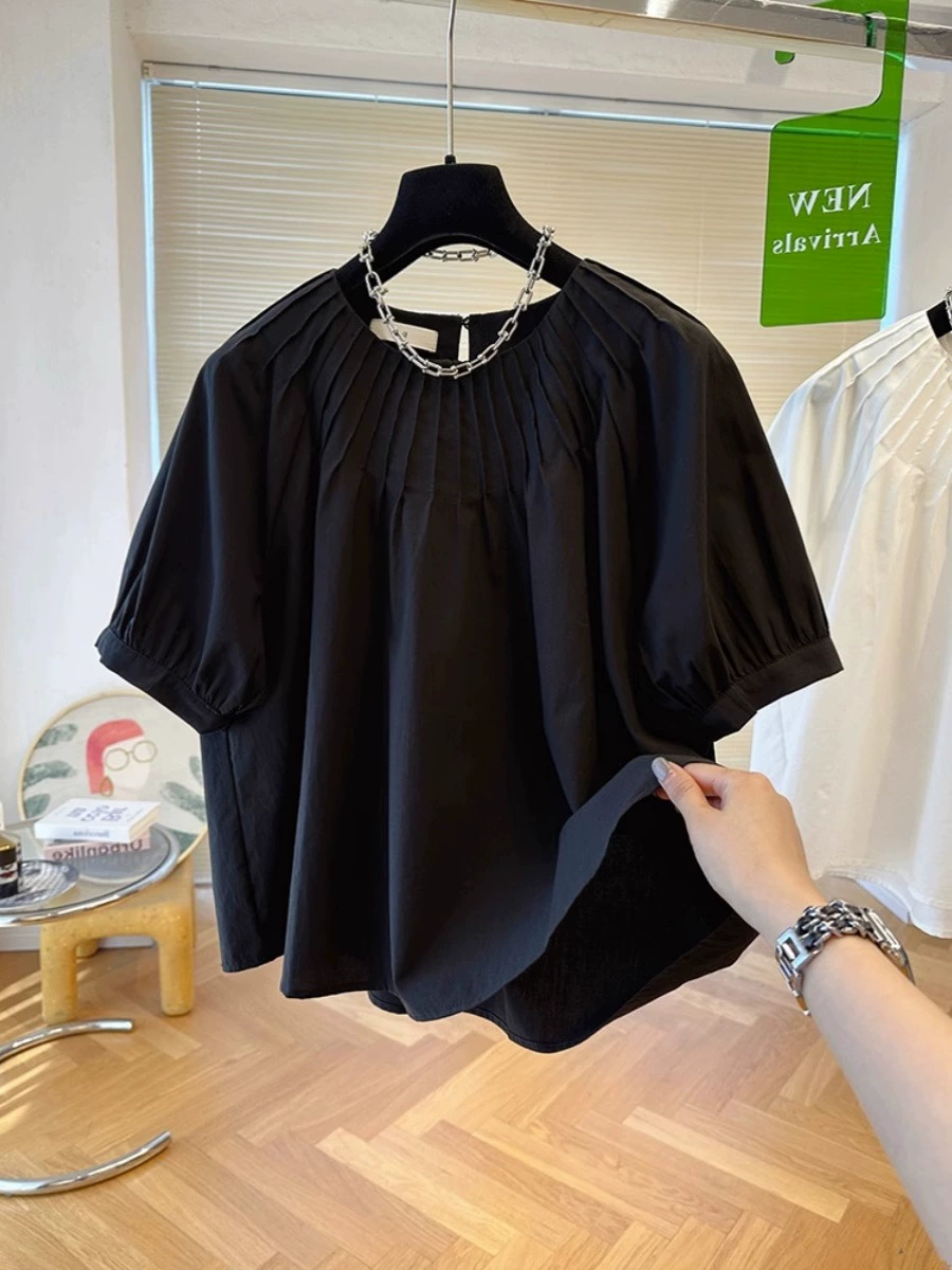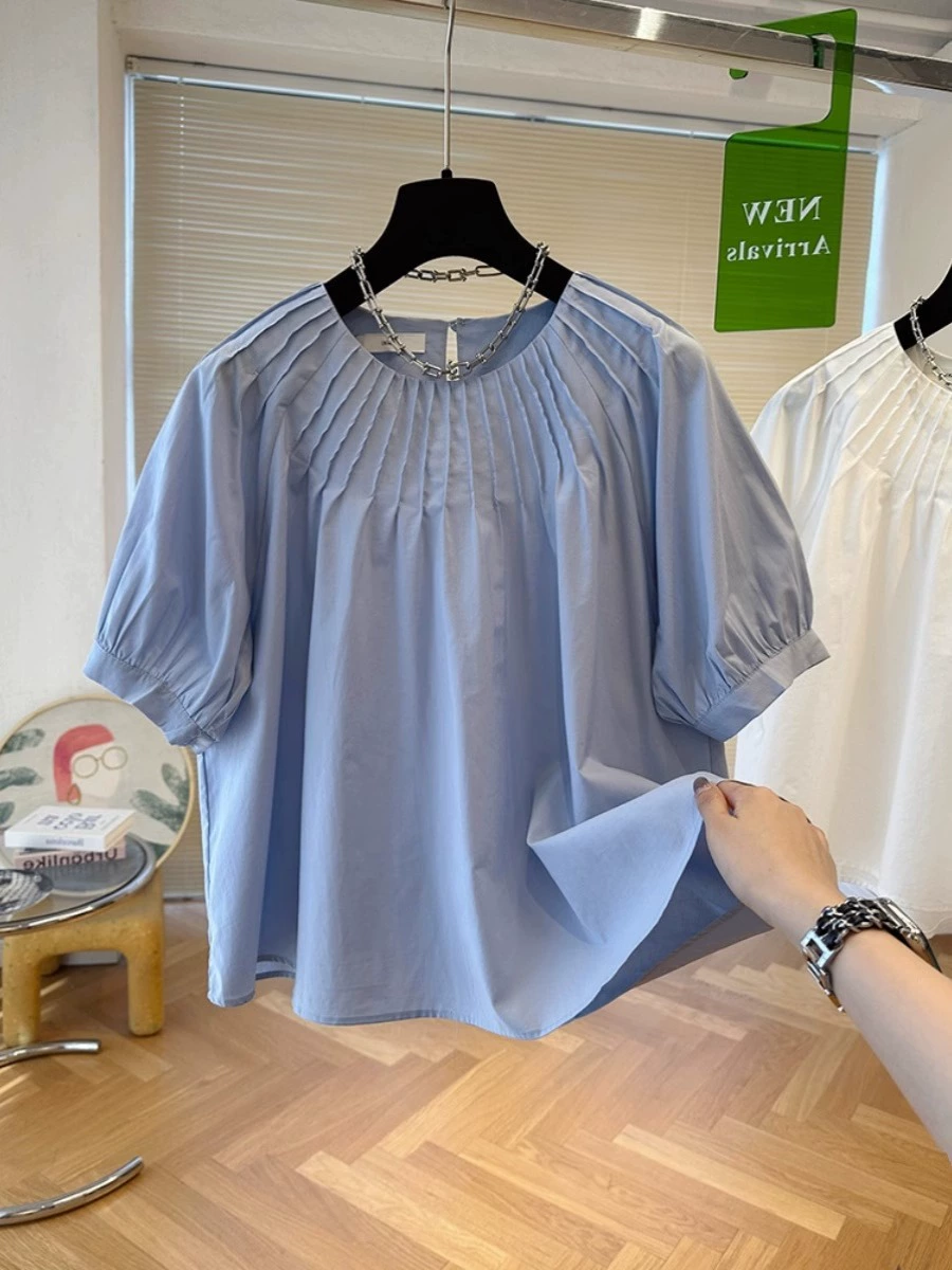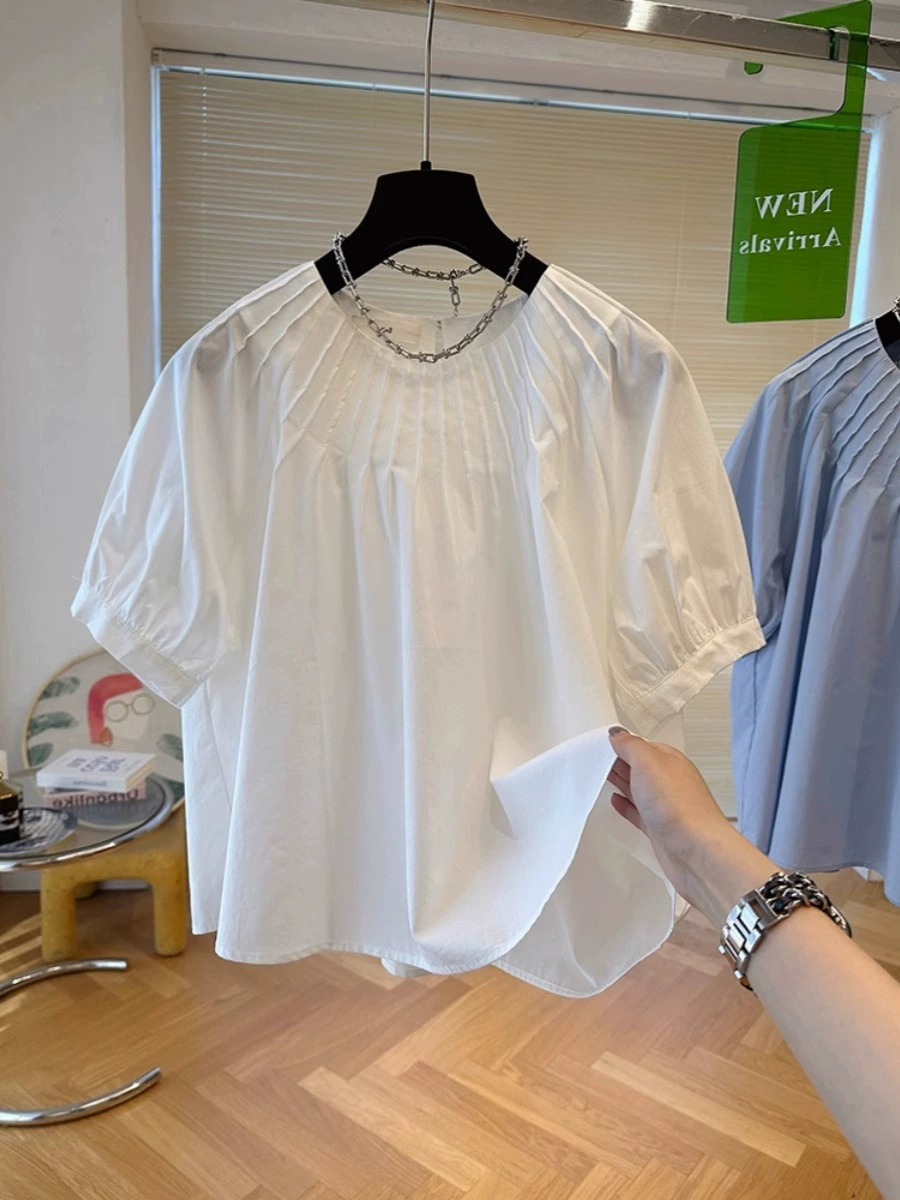 | nameOriginal | Age-reducing pleated round neck short-sleeved stylish and beautiful shirt |