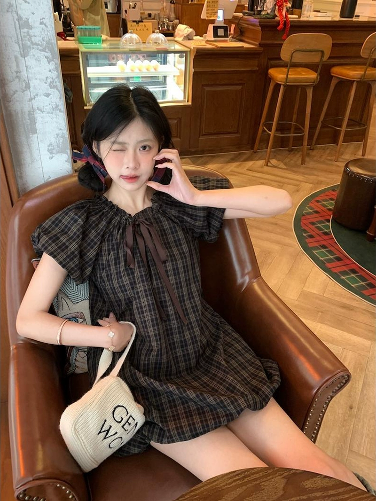 Age-reducing retro plaid summer lace-up bud dress