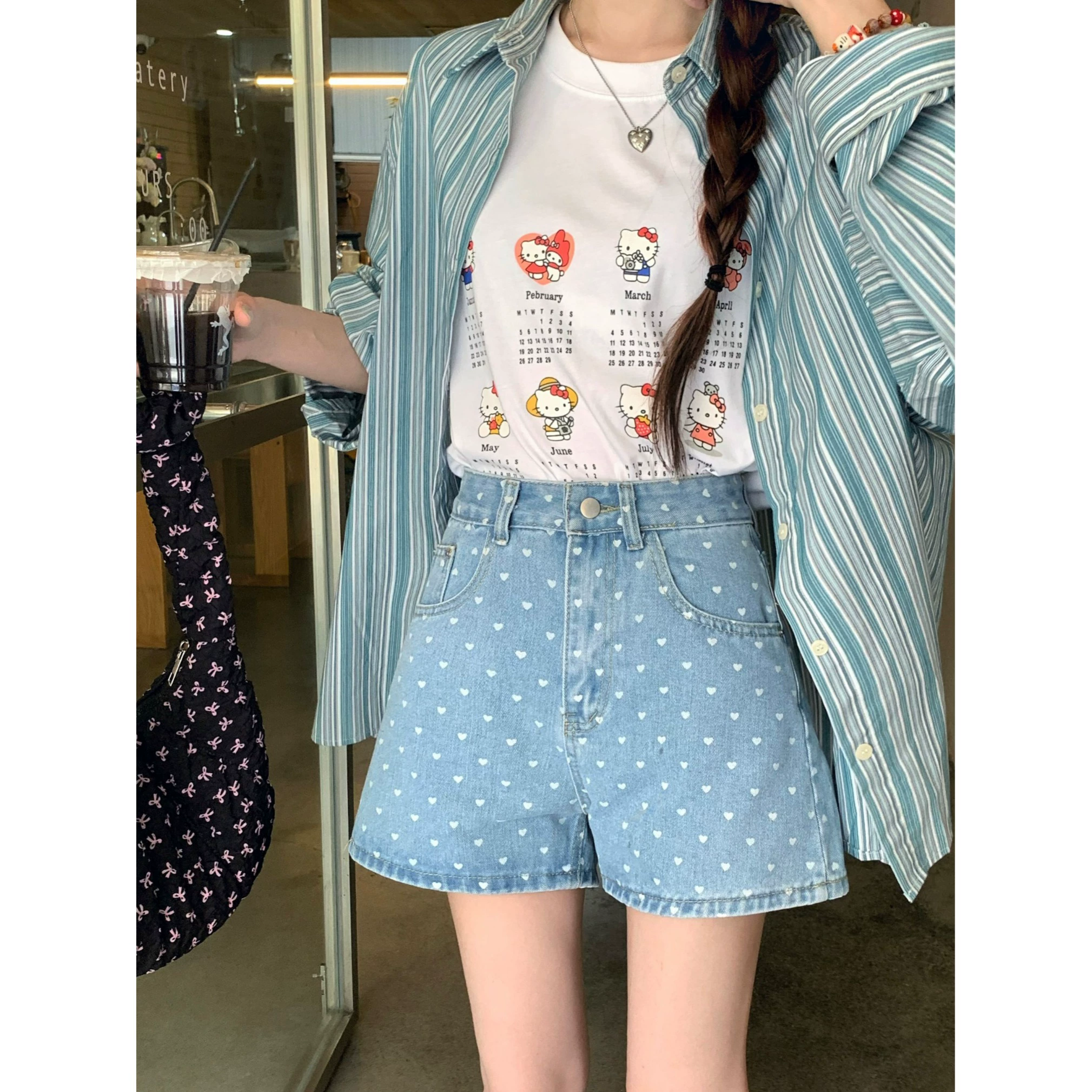 Age-reducing retro polka-dot high-waisted wide-leg denim shorts